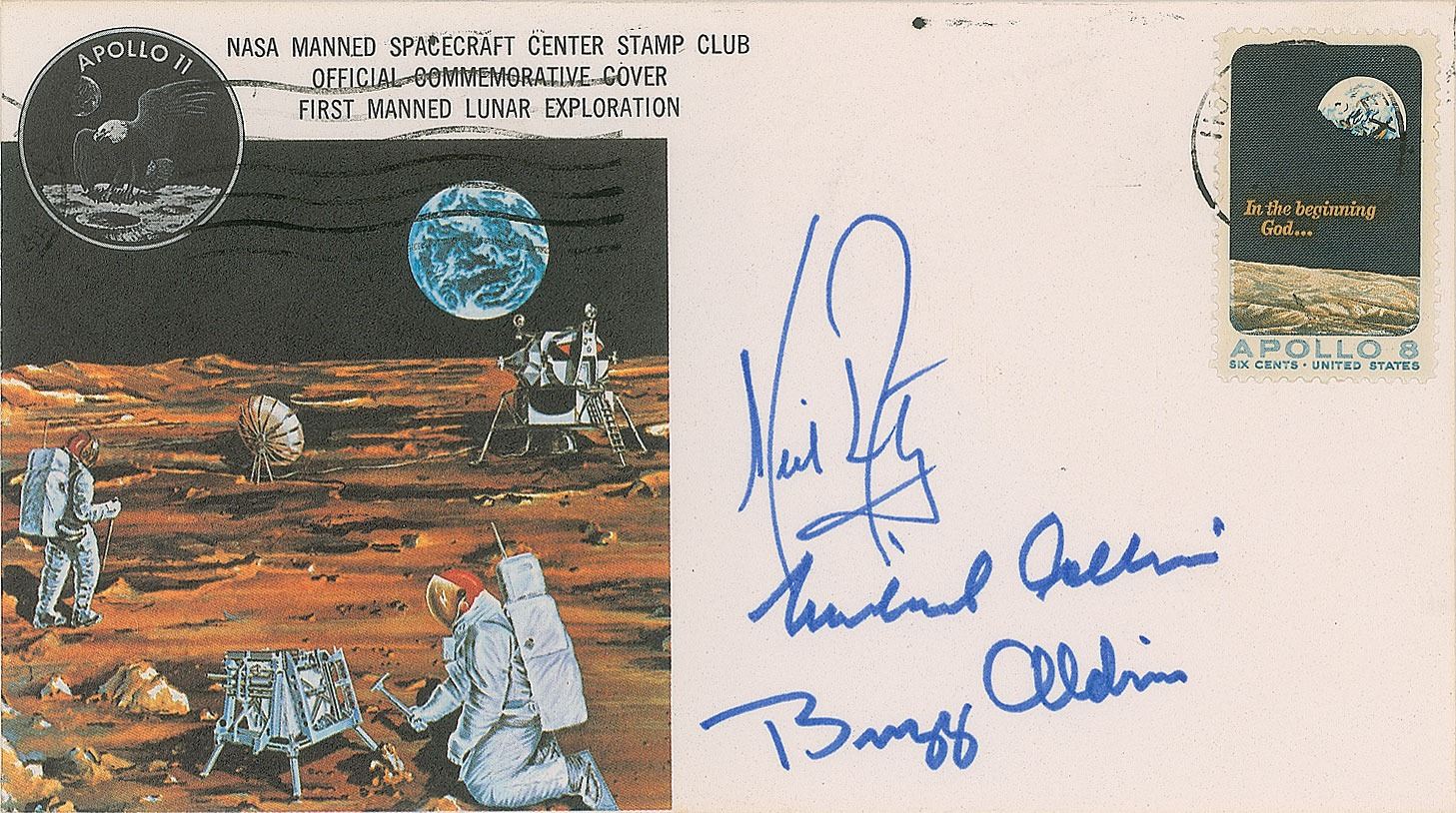 Extremely desirable Apollo 11 'Type 1' insurance cover with a color cachet depicting the moon landing, bearing several July 20, 1969, Houston, Texas postmarks, signed in blue felt tip by Neil Armstrong, Buzz Aldrin, and Michael Collins. In fine to very fine condition. These famous insurance covers, produced immediately prior to space missions in order to provide financial security for astronauts' families in case of disaster, have earned near-legendary status as the ultimate space-related philatelic item, and exist as one of the most coveted formats for astronaut autographs.