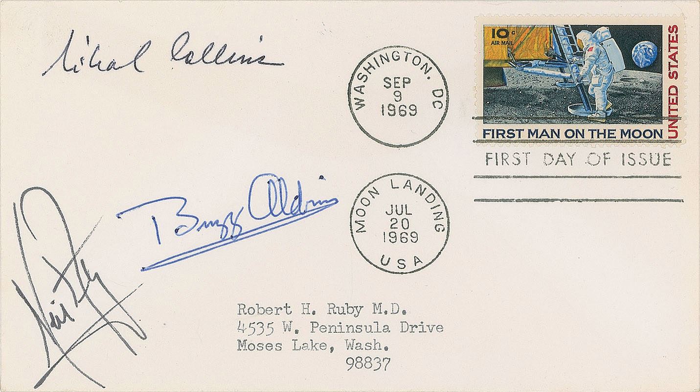 Very desirable FDC postmarked July 20, 1969, the date of the Apollo 11 moon landing, and September 9, 1969, the issue date for the jumbo-sized commemorative "First Man on the Moon" stamp, which is affixed to upper right corner, signed in thin black felt tip by Neil Armstrong, in blue ballpoint by Buzz Aldrin, and in black ballpoint by Michael Collins. In very fine condition. Accompanied by a certificate of authenticity from Astronaut Central for the Collins signature.