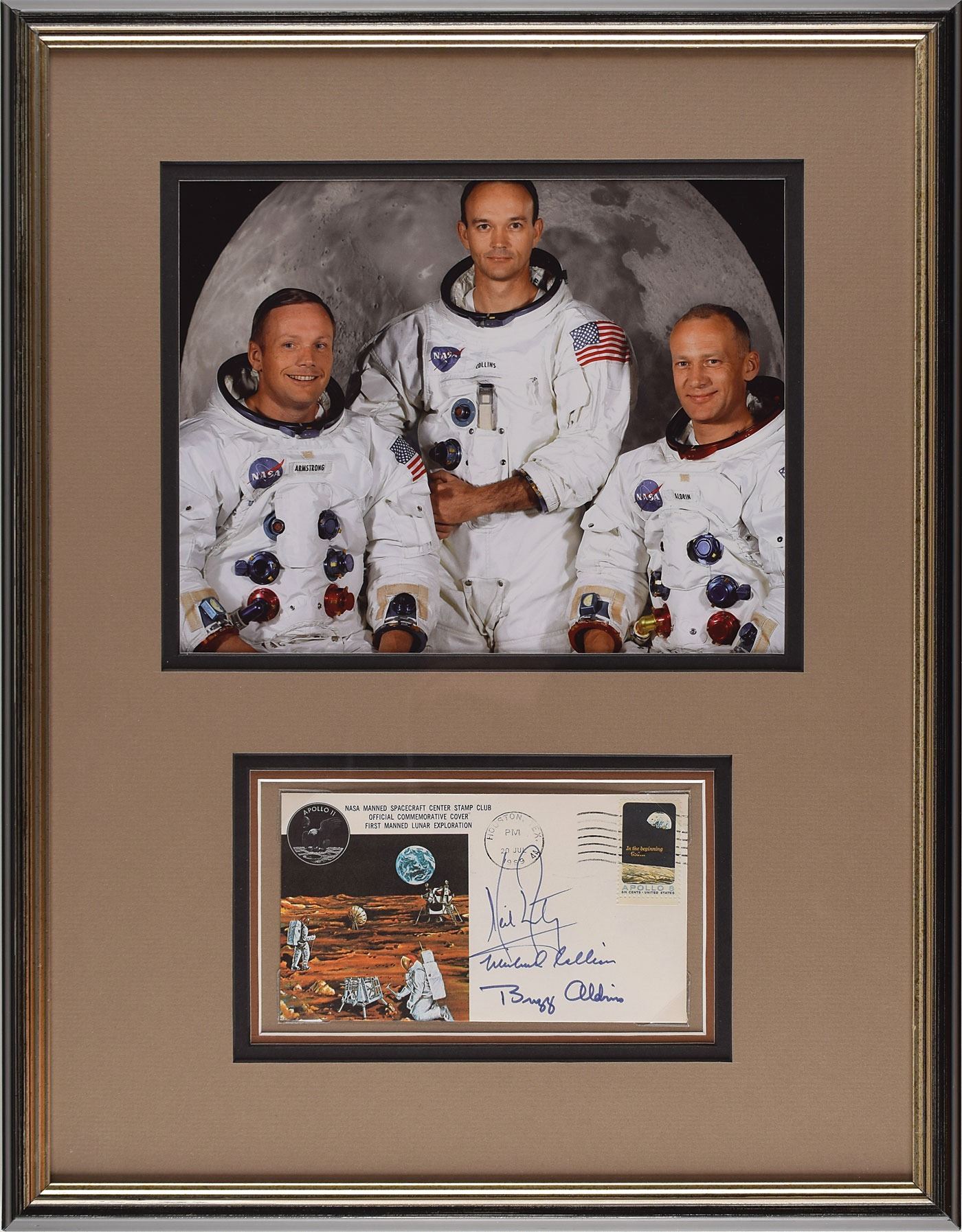 Immensely desirable Apollo 11 ‘Type 1' crew insurance postal cover with a color cachet of lunar surface activities, postmarked at Houston on July 20, 1969, the moon landing date of the lunar module Eagle, signed in black felt tip just prior to launch by Neil Armstrong, Michael Collins, and Buzz Aldrin. These covers were flown to Houston after launch for cancellation by Apollo 10 Commander Tom Stafford in his T-38 jet. Archivally double-matted and framed with a photo of the crew in their white space suits to an overall size of 15.25 x 19.5. In very fine condition. The famous insurance covers, first produced for Apollo 11, were to provide financial security for astronauts' families in case of disaster. They have earned near-legendary status as the ultimate space-related philatelic item and one of the most sought-after formats for astronaut autographs.