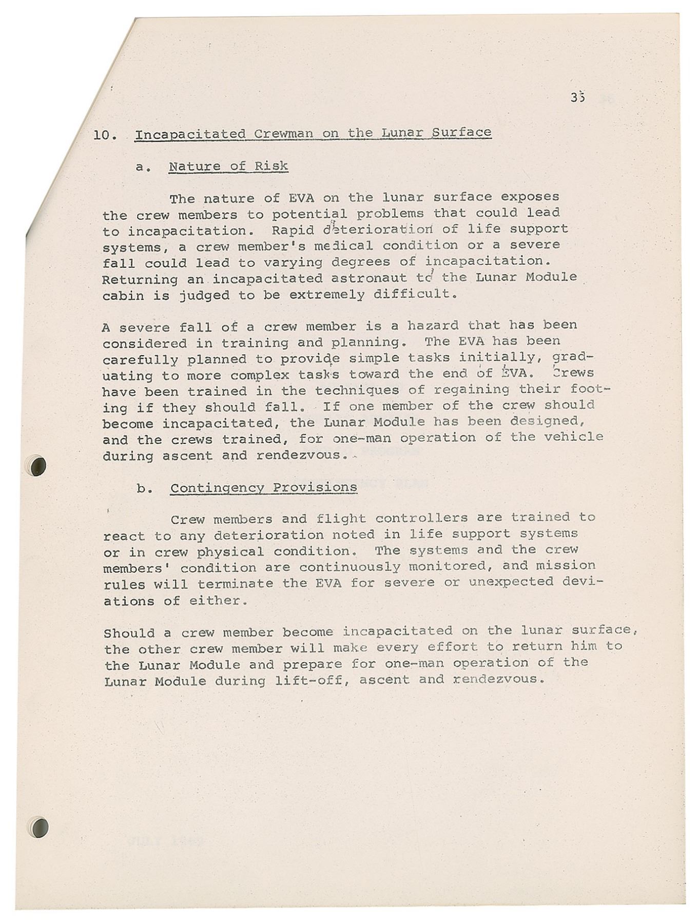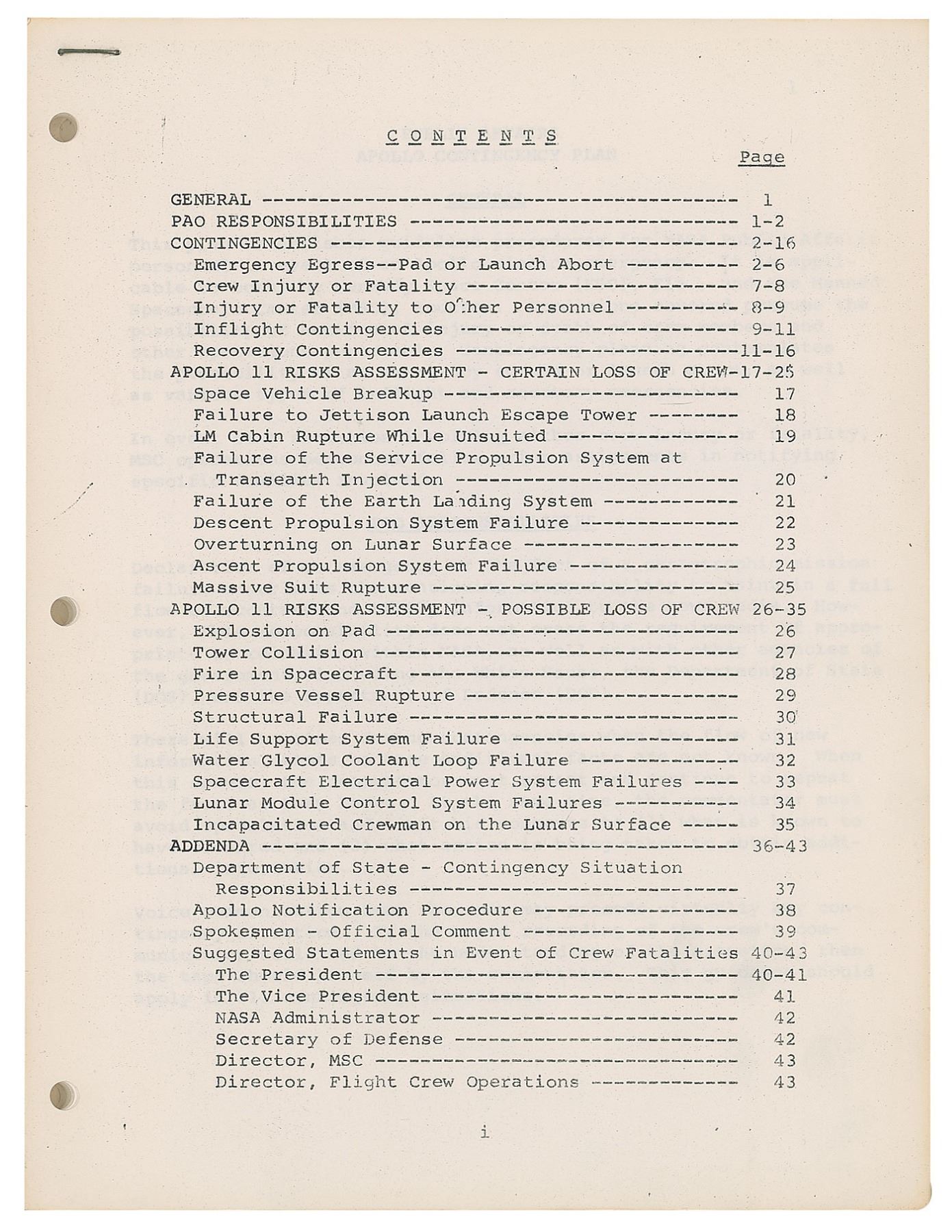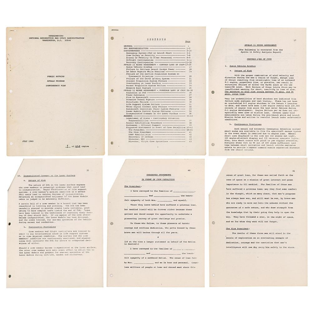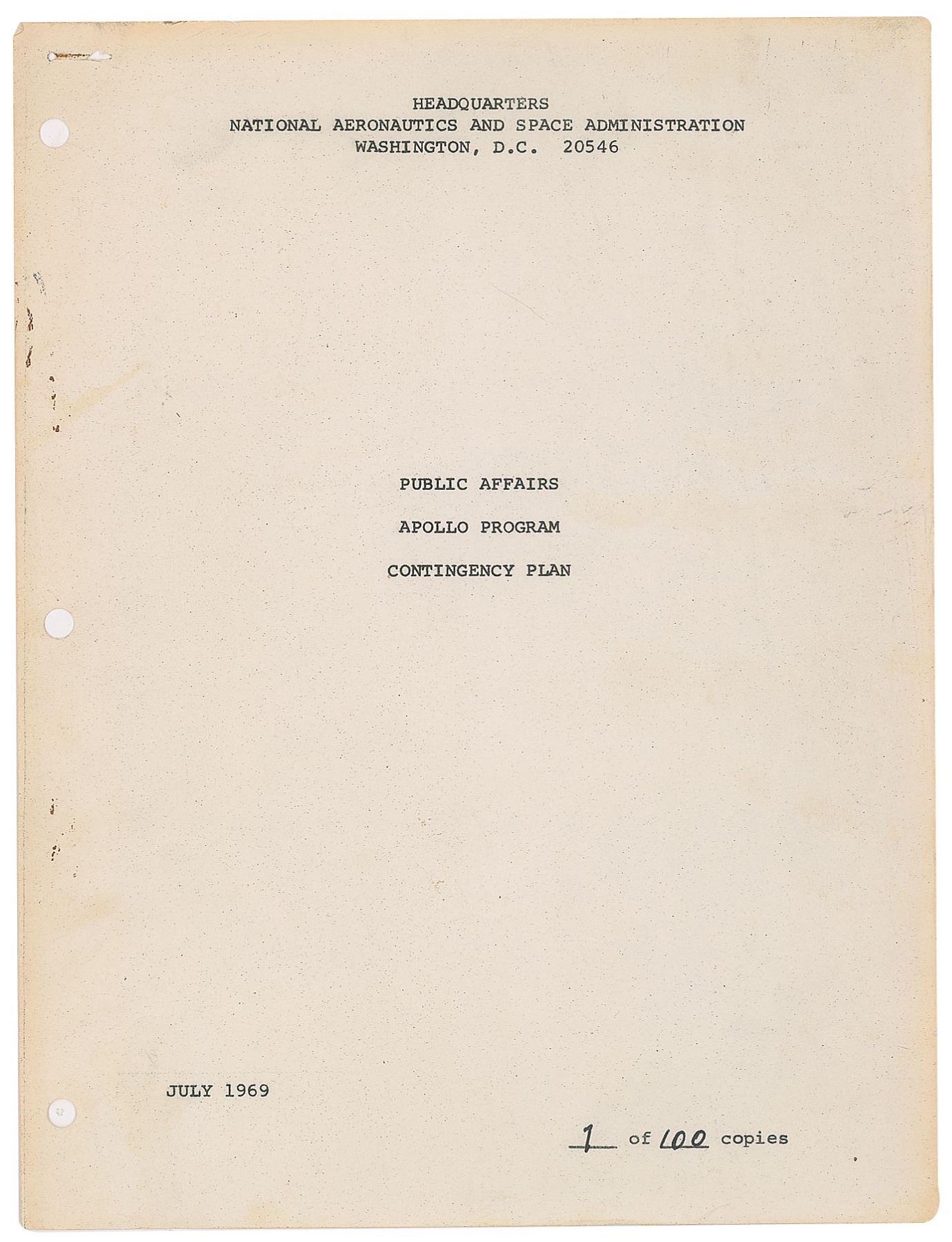Rare official NASA public relations contingency plan for Apollo 11, numbered 1 of 100 and belonging to Public Relations Director Lt. Col. Walter Pennino, 49 pages, 8 x 10.5, July 1969. The significant document outlines NASA's public response in case of disaster during Apollo 11, up to and including the deaths of the crew in various scenarios; given the sensitive content, all 100 copies had to be accounted for. It includes various contingencies and risk assessments for "Certain Loss of Crew" and "Possible Loss of Crew," in events like space vehicle breakup, failure of the Earth landing system, overturning on lunar surface, explosion on pad, fire in spacecraft, Lunar Module control system failures, and incapacitated crewman on the lunar surface. An addendum provides suggested statements to be in the event of crew fatalities from public officials, including those from the president and vice president. In very good to fine condition, with light creasing to the first page, some pages detached from the staple, and general handling wear.
