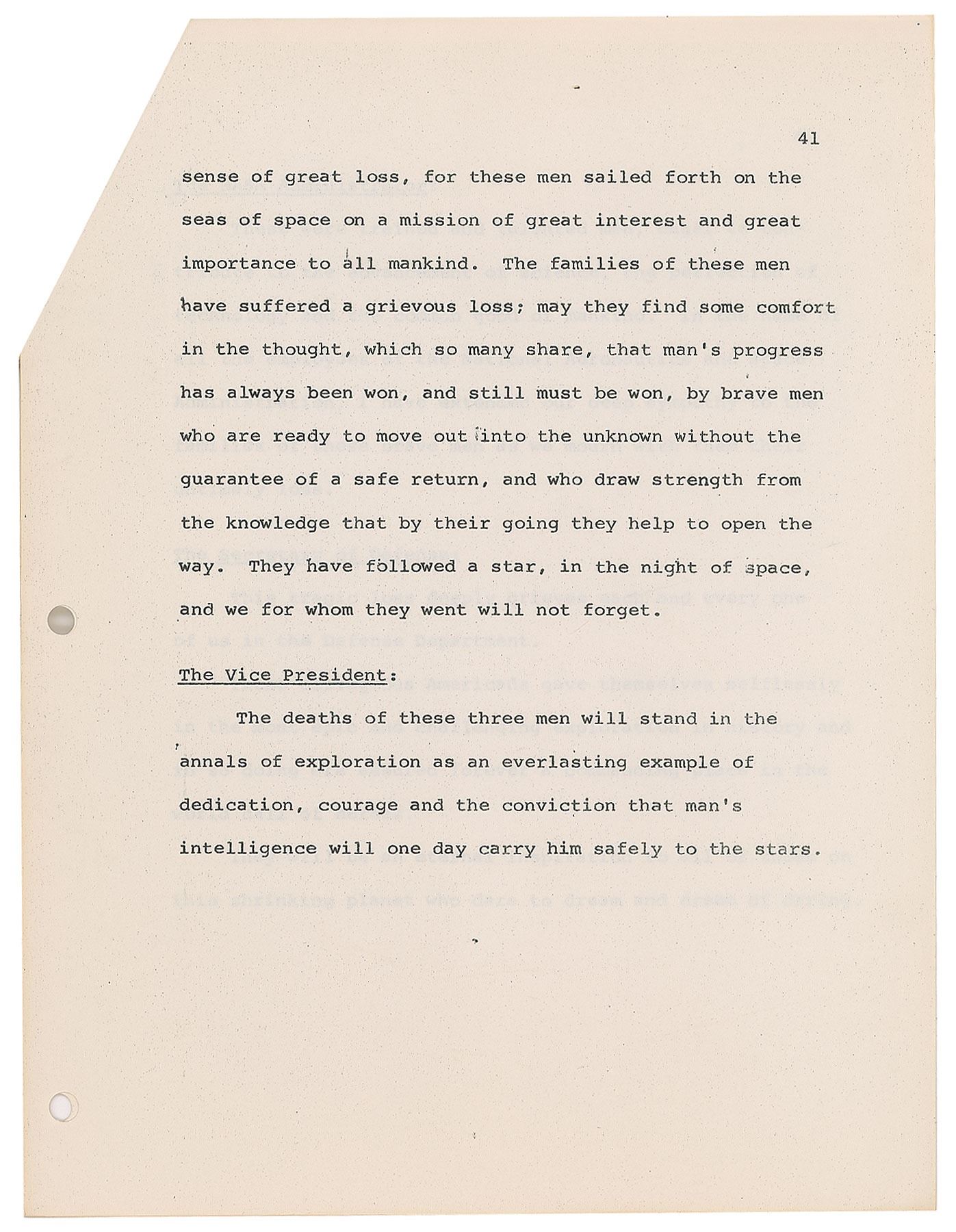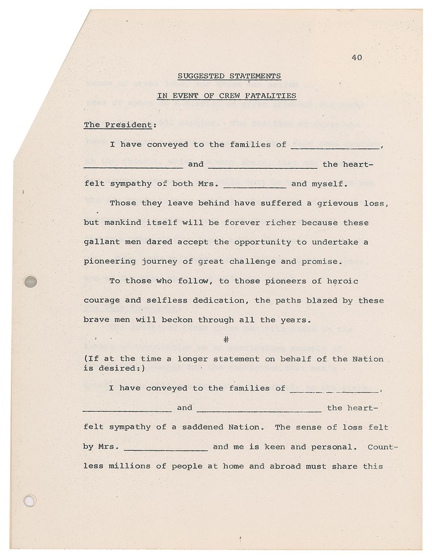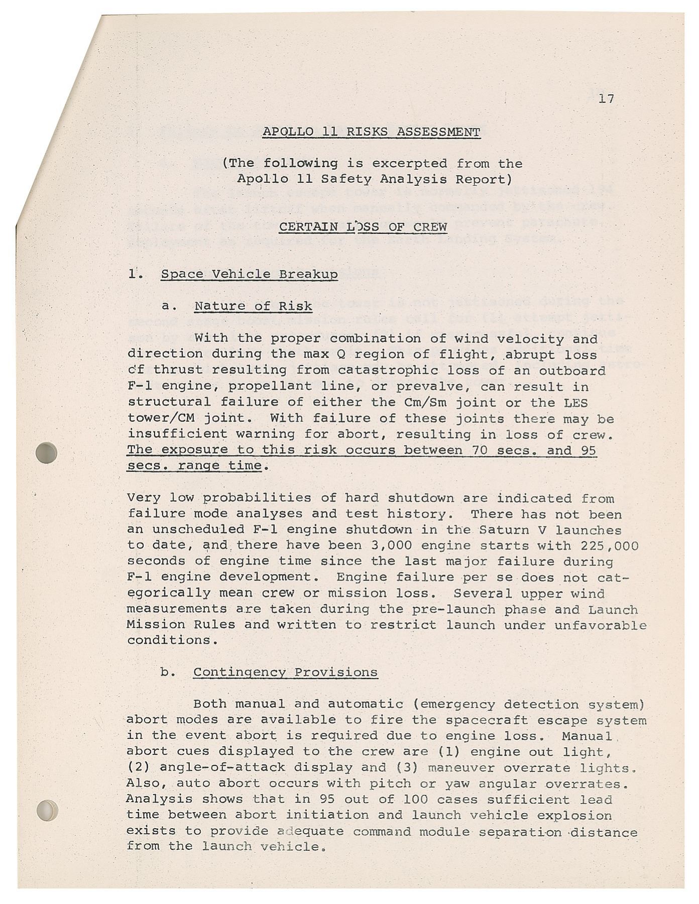 Rare official NASA public relations contingency plan for Apollo 11, numbered 1 of 100 and belonging to Public Relations Director Lt. Col. Walter Pennino, 49 pages, 8 x 10.5, July 1969. The significant document outlines NASA's public response in case of disaster during Apollo 11, up to and including the deaths of the crew in various scenarios; given the sensitive content, all 100 copies had to be accounted for. It includes various contingencies and risk assessments for "Certain Loss of Crew" and "Possible Loss of Crew," in events like space vehicle breakup, failure of the Earth landing system, overturning on lunar surface, explosion on pad, fire in spacecraft, Lunar Module control system failures, and incapacitated crewman on the lunar surface. An addendum provides suggested statements to be in the event of crew fatalities from public officials, including those from the president and vice president. In very good to fine condition, with light creasing to the first page, some pages detached from the staple, and general handling wear.