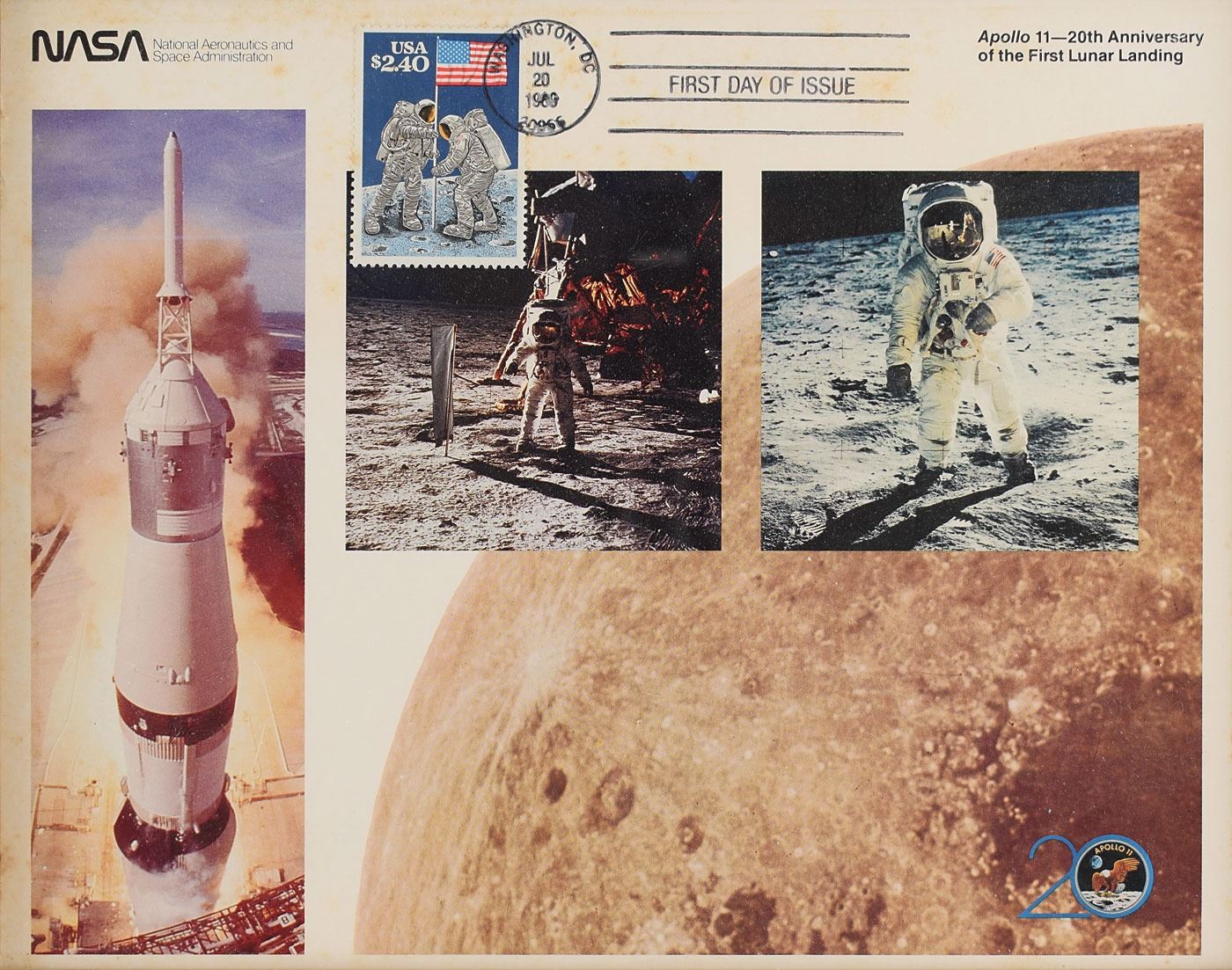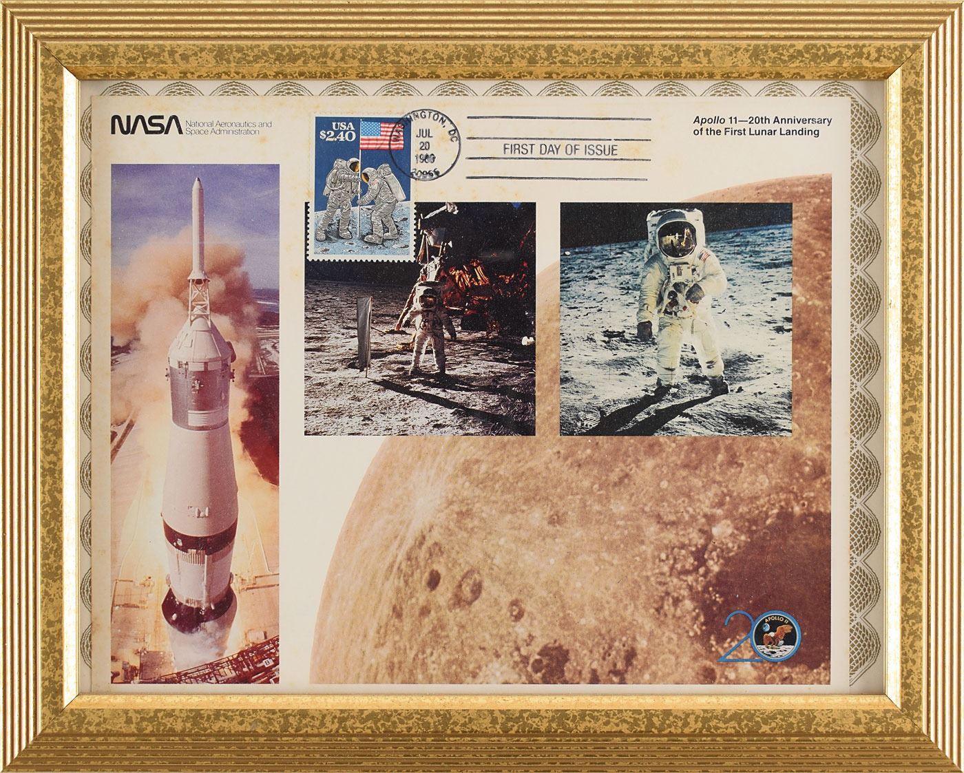 Oversized commemorative FDC honoring the 20th Anniversary of the historic Apollo 11 moon-landing, featuring a collage of four images from the mission with upper portion bearing a $2.40 astronaut postage stamp and a July 20, 1989 cancellation date. Framed to a slightly larger size. In fine condition, with scattered light foxing. Originates from the personal collection of Manfred 'Dutch' von Ehrenfried, a Mercury, Gemini and Apollo Flight Controller, Apollo Pressure Suit Test Subject, NASA hi-altitude aircraft crew member, Mission Staff Engineer and Branch Chief from 1961–1971.