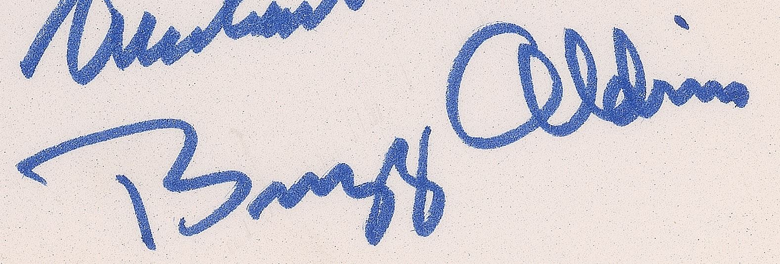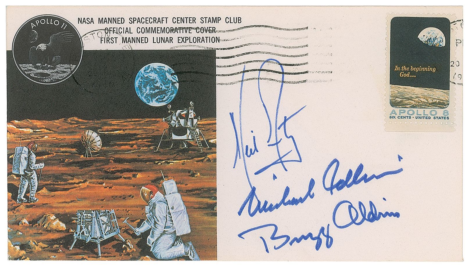 Extremely desirable Apollo 11 ‘Type 1' crew insurance postal cover with a color cachet of lunar surface activities, postmarked at Houston on July 20, 1969, the moon landing date of the lunar module Eagle, signed in blue felt tip just prior to launch by Neil Armstrong, Michael Collins, and Buzz Aldrin. These covers were flown to Houston after launch for cancellation by Apollo 10 Commander Tom Stafford in his T-38 jet. In fine condition. The famous insurance covers, first produced for Apollo 11, were to provide financial security for astronauts' families in case of disaster. They have earned near-legendary status as the ultimate space-related philatelic item and one of the most sought-after formats for astronaut autographs.