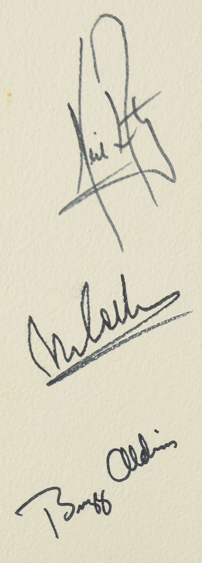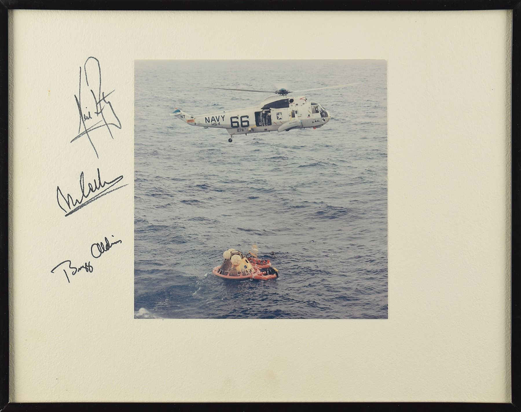 Outstanding color glossy 7 x 7 photo of the Apollo 11 recovery, affixed to a 14 x 11 mount, signed on the mount in black felt tip, "Neil Armstrong," "M. Collins," and "Buzz Aldrin." In fine condition, with some very faint soiling to the bottom of the mount. An appealing oversized piece fully signed by the first crew to touch down on the lunar surface.