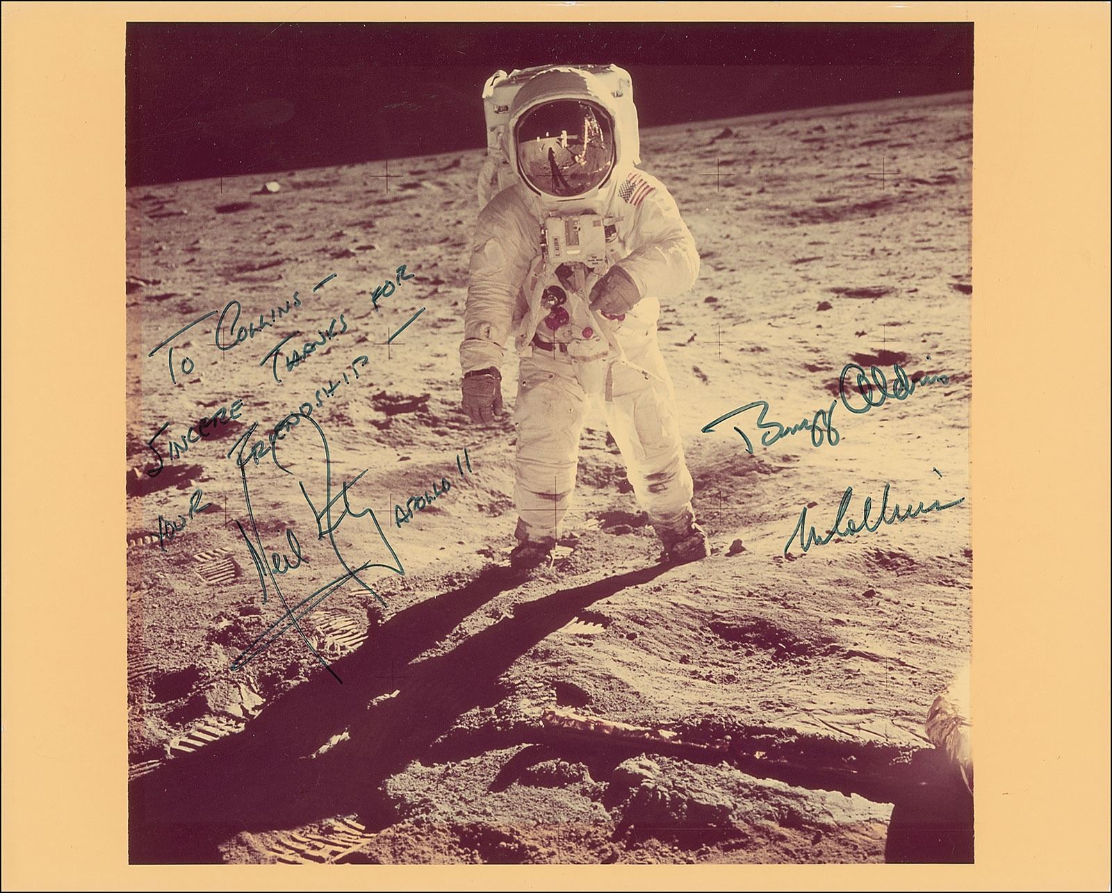 Official color glossy 10 x 8 NASA photo of Lunar Module Pilot Buzz Aldrin at Tranquility Base during the Apollo 11 mission, his visor showing a small reflection of the photographer, Commander Neil Armstrong, signed and inscribed in black felt tip, "To Collins—Sincere thanks for your friendship—Neil Armstrong, Apollo 11," "Buzz Aldrin," and "Mike Collins." Reverse of photo bears faded purple NASA caption text. Affixed along its top edge to a slightly larger cardstock board. In fine condition, with uniform overall toning. Accompanied by a full letter of authenticity from Zarelli Space Authentication.