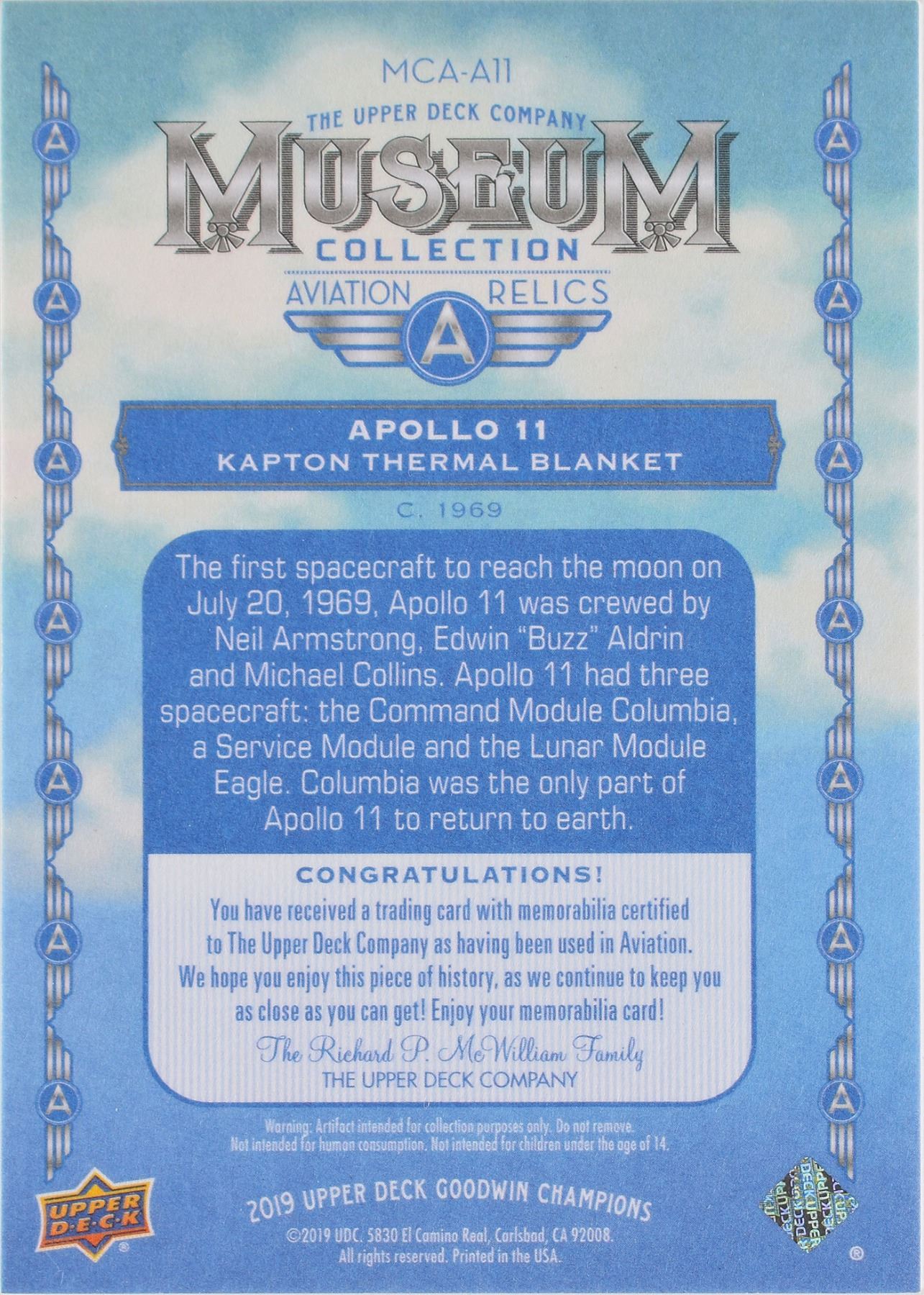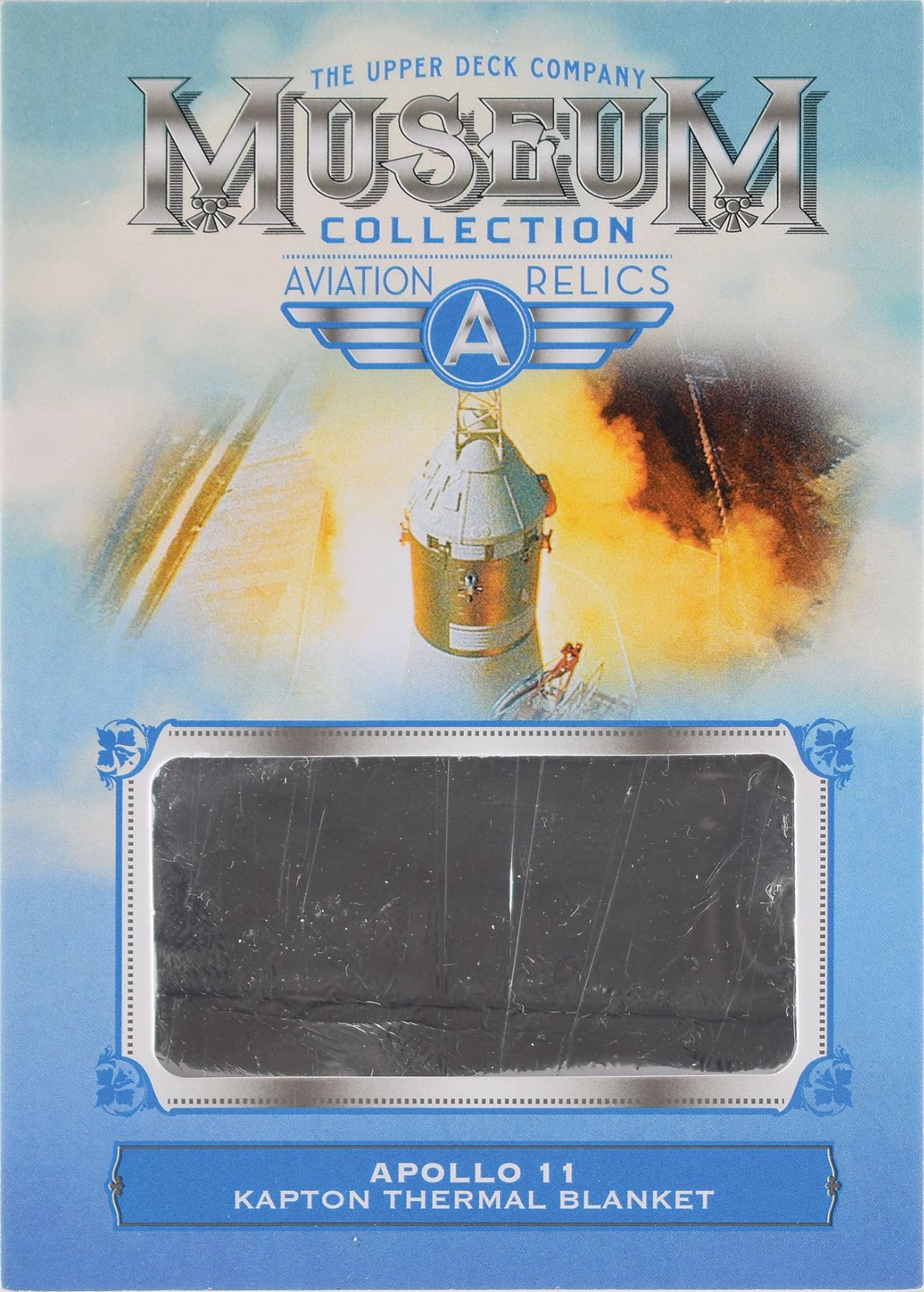 Museum Collection Aviation Relics trading card from the Upper Deck Company, 2.5 x 3.5, containing a 1.75 x .75 swatch of flown Kapton thermal blanket from the Apollo 11 Command Module Columbia. In fine condition.
