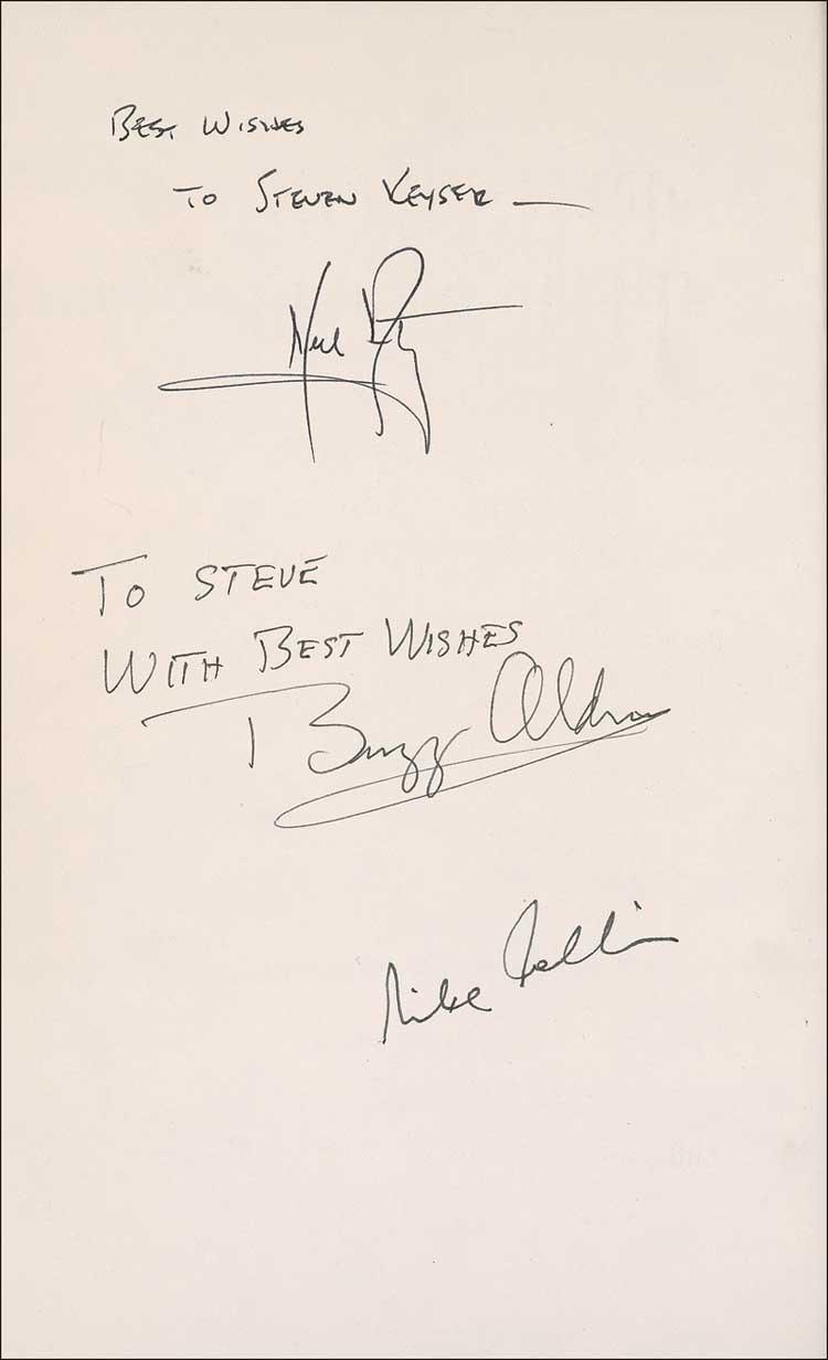 Signed book: First on the Moon. First edition, first printing. Boston: Little, Brown, and Company, 1970. Hardcover with dustjacket, 6.25 x 9.5, 434 pages. Beautifully signed and inscribed on the reverse of the half-title page, “Best wishes to Steven Keyser—Neil Armstrong,” “To Steve, Best wishes, Buzz Aldrin,” and “Michael Collins.” In fine condition, with some light rubbing to covers, scattered light wear and small tears to dustjacket (heavier tear to back dustjacket), and a small notation to inside front of dustjacket. An uncommon format for this increasingly elusive and most desirable of Apollo crews! Pre-certified Scott Cornish and RRAuction COA.