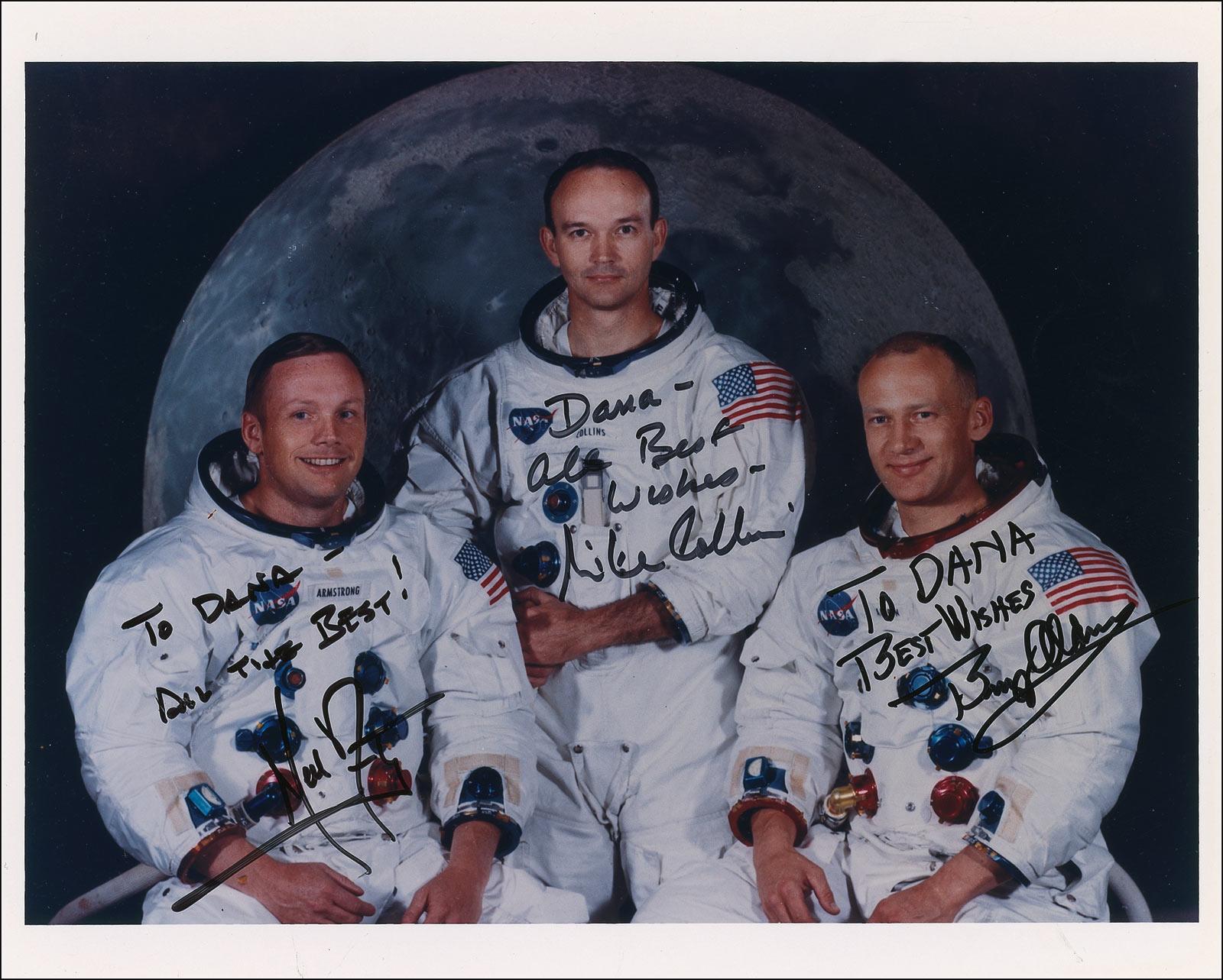 Superb color glossy 10 x 8 photo of the Apollo 11 prime crew, signed and inscribed in black felt tip to Dana by Neil Armstrong, Michael Collins, and Buzz Aldrin. In very fine condition. Pre-certified Scott Cornish and RRAuction COA.