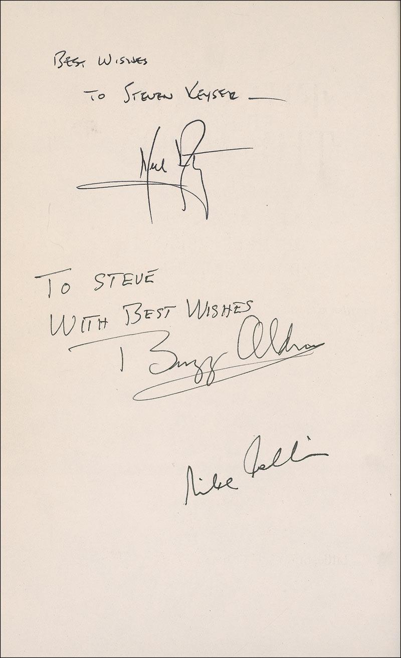 Signed book: First on the Moon. First edition, first printing. Boston: Little, Brown, and Company, 1970. Hardcover with dustjacket, 6.25 x 9.5, 434 pages. Beautifully signed and inscribed on the reverse of the half-title page, “Best wishes to Steven Keyser—Neil Armstrong,” “To Steve, Best wishes, Buzz Aldrin,” and “Michael Collins.” In fine condition, with some light rubbing to covers, scattered light wear and small tears to dustjacket (heavier tear to back dustjacket), and a small notation to inside front of dustjacket. An uncommon format for this increasingly elusive and most desirable of Apollo crews!