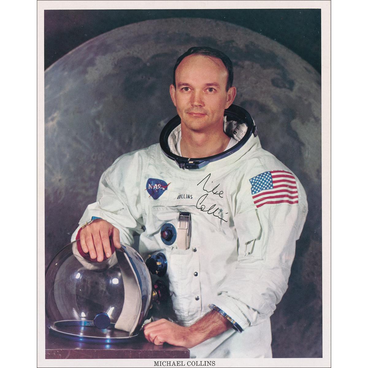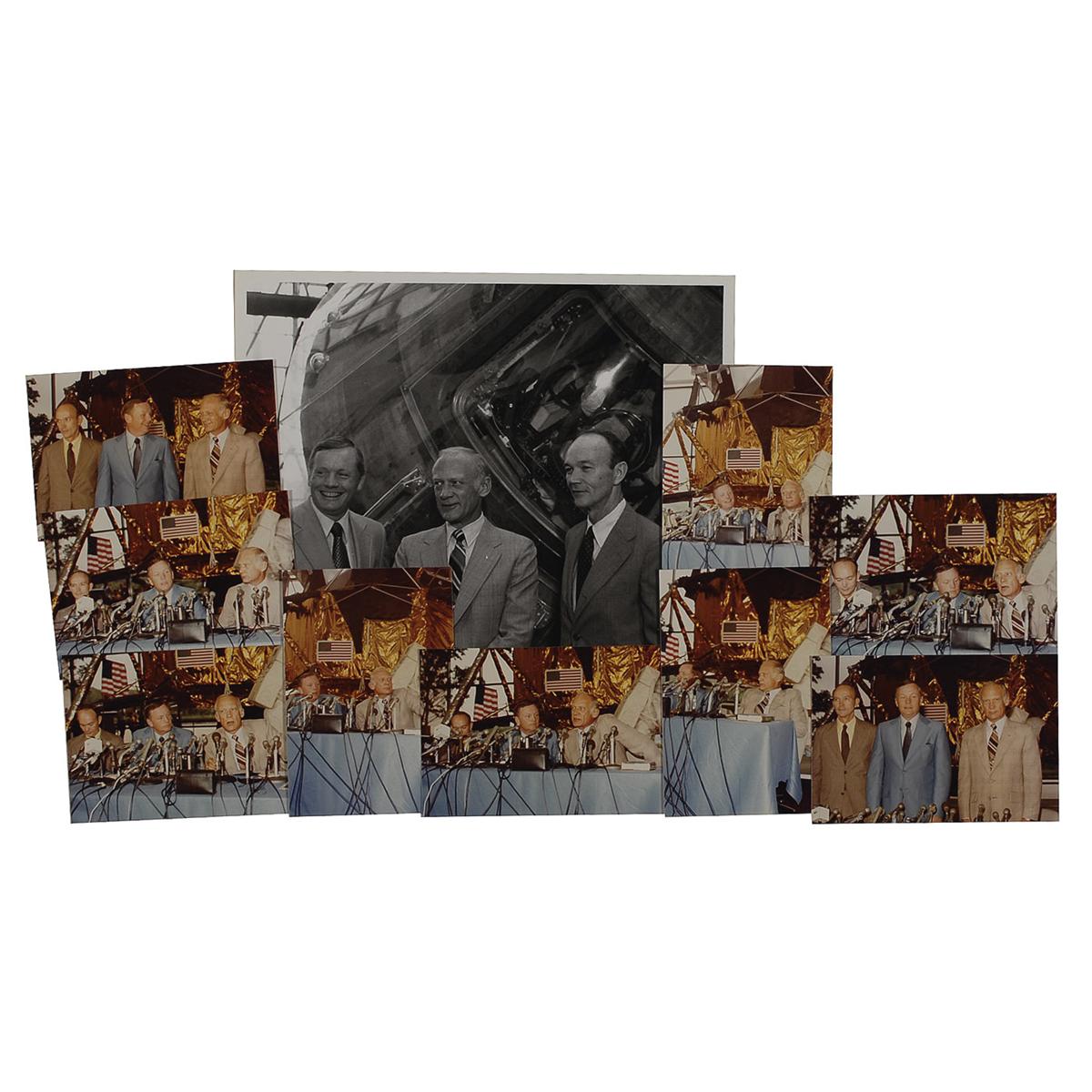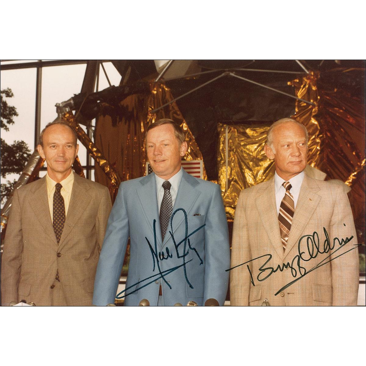 Original color 5 x 3.5 candid snapshot of the Apollo 11 crew at a press conference in honor of the 10th anniversary of the Apollo 11 lunar landing, standing in front of a lunar landing module at the National Air and Space Museum, signed in black felt tip by Neil Armstrong and Buzz Aldrin. Dr. Anthony J. Cipriano and artist William Numeroff have annotated the reverse of the photo: “Signature of Buzz Aldrin obtained from him in Car when Tony Cipriano drove him to Manhattan after his induction to N.J. Aviation Hall of Fame – May 20/80. Witnessed by William J. Numeroff.” “Signature of Neil Armstrong obtained by me at Wing’s Club Luncheon NYC 5/18/88. A J Cipriano.” Noted in the lower left that this photograph was taken at the museum: “Photo By A.J. Cipriano / NASM 7-20-79 10th Anniv Apollo 11.”; and a color 8 x 10 NASA photo of Michael Collins in his space suit in front of a lunar background, signed in black ink. In fine condition. Accompanied by nine more unsigned candid photos of the crew from the event, as well as an unsigned glossy 10 x 8.