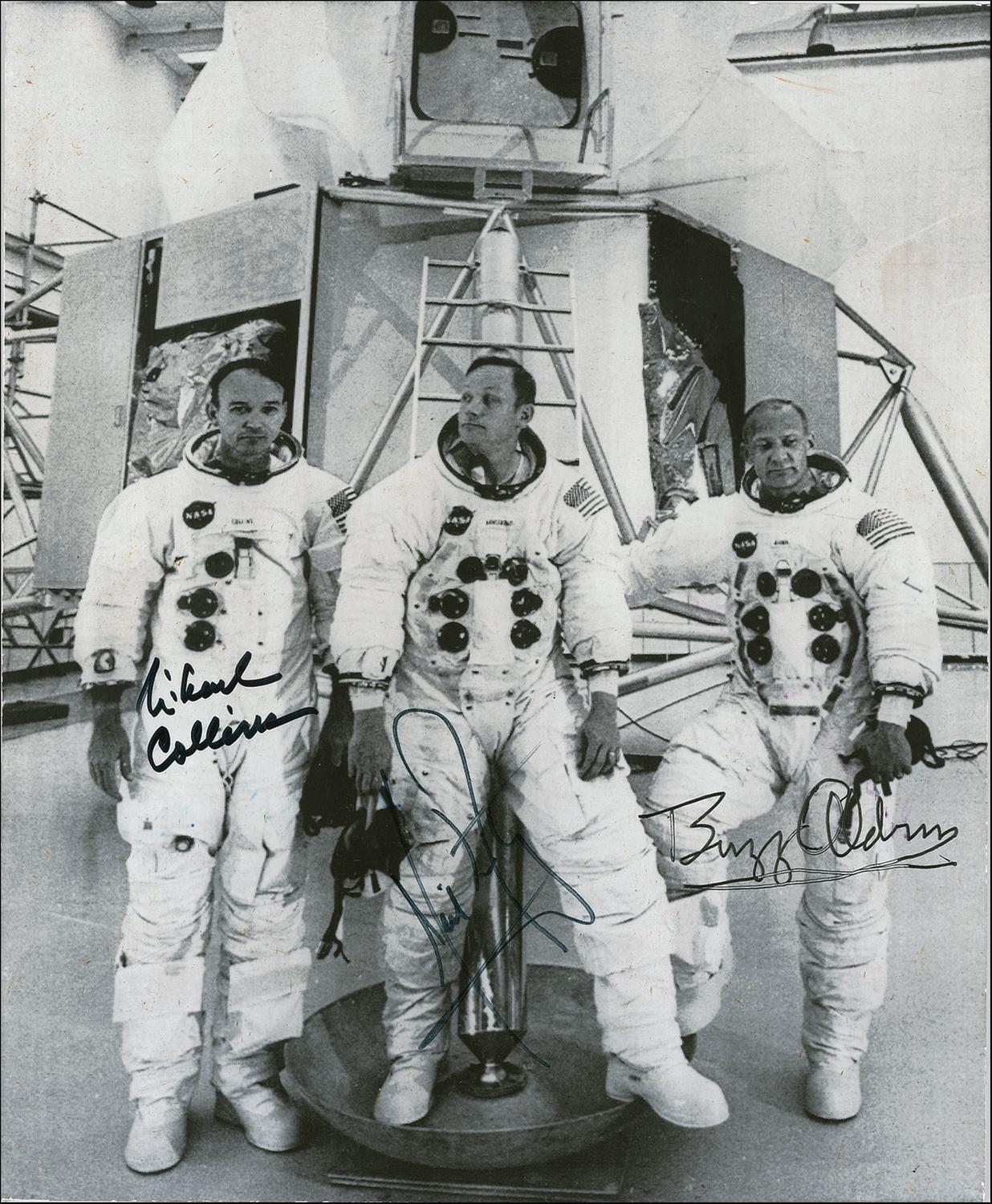 Interesting and uncommon 7 x 8.75 photo of the Apollo 11 crew, posing at the ladder of their lunar lander and clad in their spacesuits, signed in black felt tip by Neil Armstrong, Buzz Aldrin, and Michael Collins. Photo is affixed to an identical size piece of heavy cardstock. Scattered light surface marks and wear, some light contrast to Armstrong’s signature, and some scattered light surface impressions, otherwise fine condition. An unusual image and rare pose of the crew who all look like they have put in a long day in front of the camera. Accompanied by a certificate of authenticity from Novaspace (Collins).