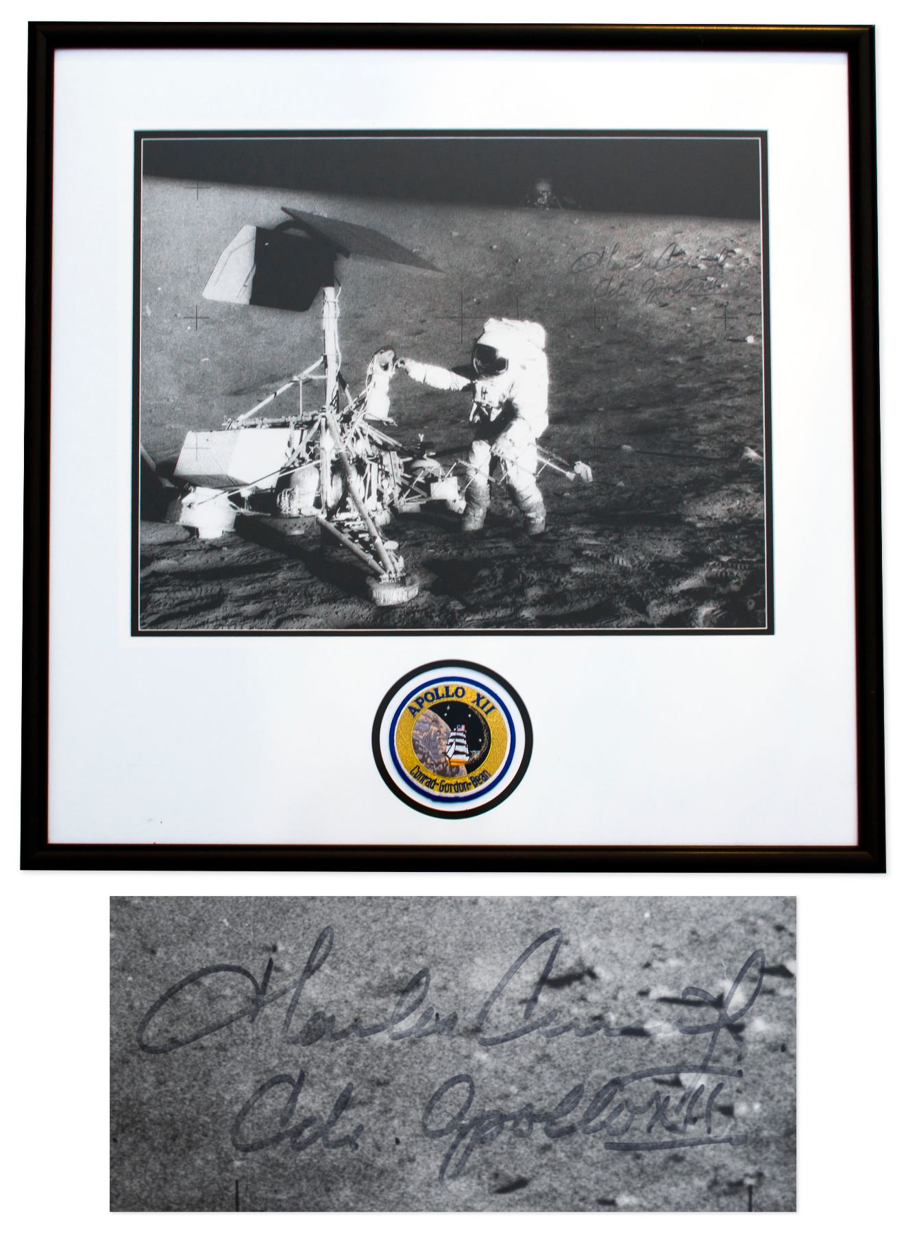 Apollo 12 moonwalker, Charles Conrad signed photo of himself standing on the moon next to the Surveyor 3, and with the Lunar Module Intrepid in the background. Signed in bold black marker, ''Charles Conrad / Cdr. Apollo XII''. Photo with fiducials (crosshairs on NASA lunar photos) measures 20'' x 16'', matted and framed with an Apollo 12 patch to a size of 27'' square. Near fine condition.