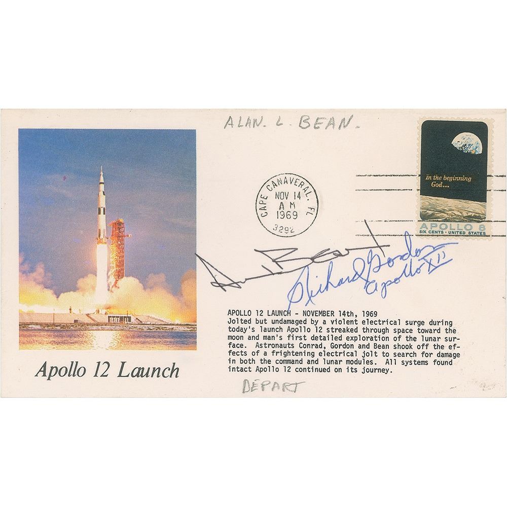 Appealing commemorative cover with a cachet honoring the launch of the Apollo 12 mission, postmarked at Cape Canaveral on November 14, 1969, signed in black ink, "Alan Bean," and in blue ballpoint, "Richard Gordon, Apollo XII." In fine condition.