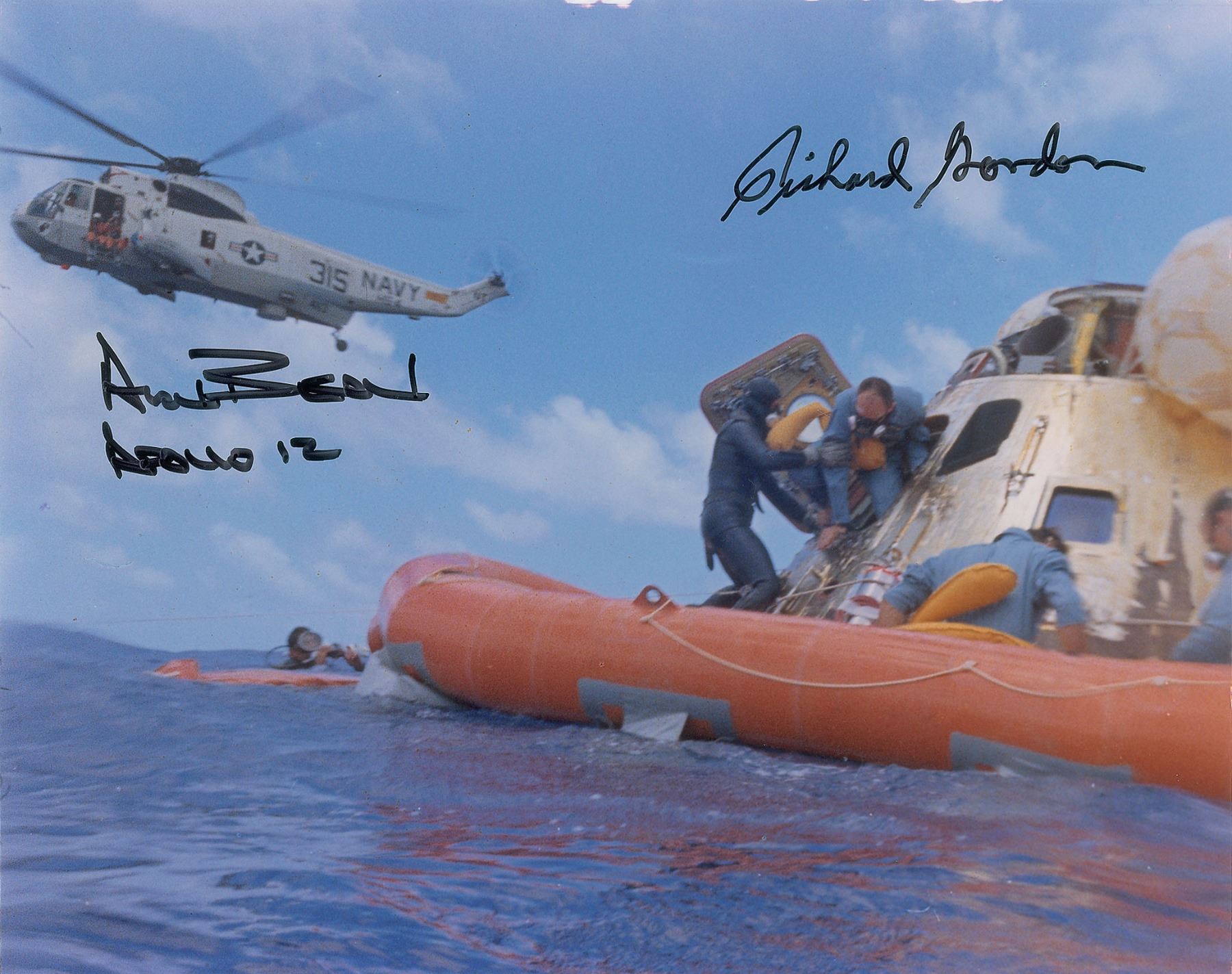Uncommon color glossy 10 x 8 photo showing a sea-level view of the oceanic recovery of the Apollo 12 crew, signed in black felt tip, "Alan Bean, Apollo 12" and "Richard Gordon." In fine condition, with some scuffs to the emulsion along the extreme top edge.