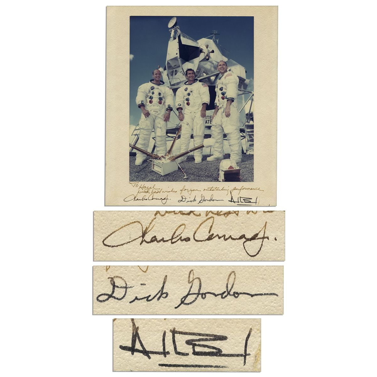 Apollo 12 crew-signed photo display. Mat beneath a color photo of the astronauts in their spacesuits is signed ''Charles Conrad'', ''Dick Gordon'' and ''Alan Bean'' in ink, with a dedication by Conrad, ''To Hazel with best wishes for your outstanding performance''. Measures 10'' x 11.5'' overall. Some toning and fading to signatures and pencil notation to verso, else near fine.