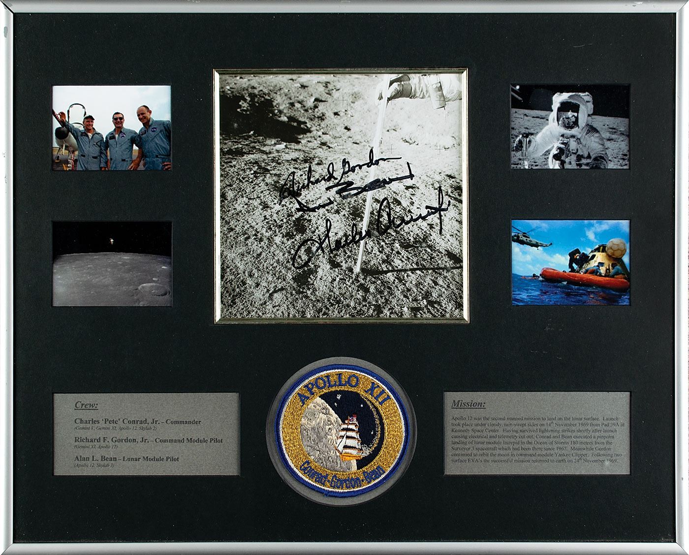 Attractive Apollo 12 display containing a glossy 7 x 7.25 photo of a lunar soil experiment, signed in black felt tip by Richard Gordon, Alan Bean, and Charles Conrad. Impressively matted with an embroidered patch, four images from the mission, and two descriptive plaques; framed to an overall size of 20.25 x 16.25. In very fine condition.