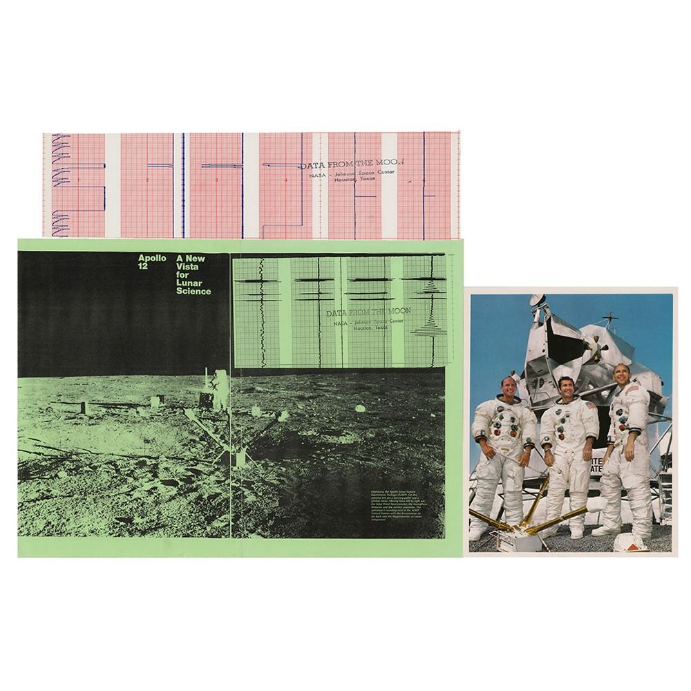 Sheet of 12.5 x 4 red-and-white graph paper with blue, EKG-like lines, stamped "Data From The Moon, NASA - Johnson Space Center, Houston, Texas." Includes a sheet describing the Apollo 12 ALSEP and an official NASA lithograph of the Apollo 12 crew. In fine condition, with light edge creasing.