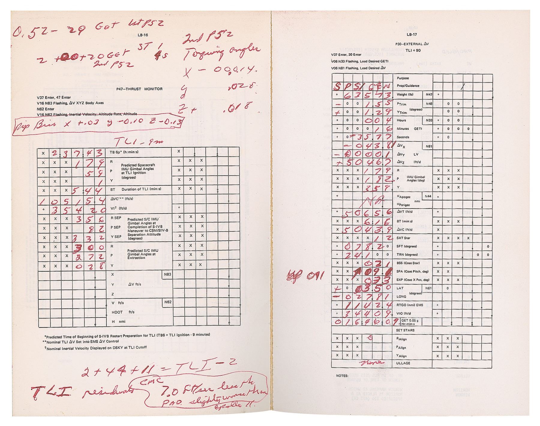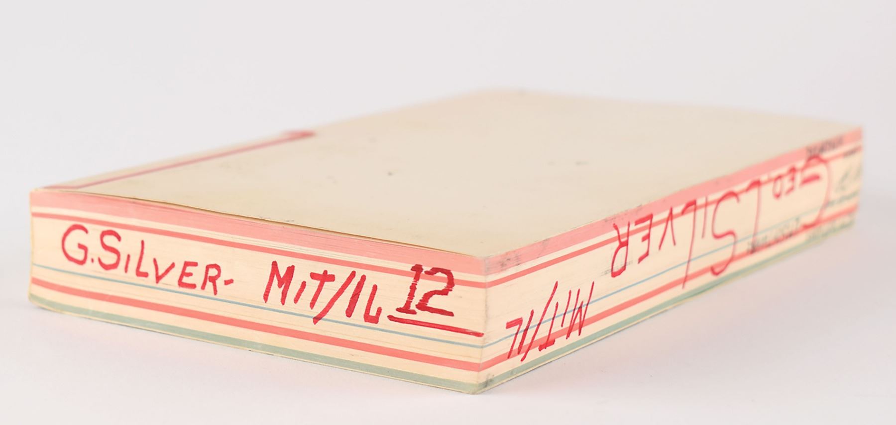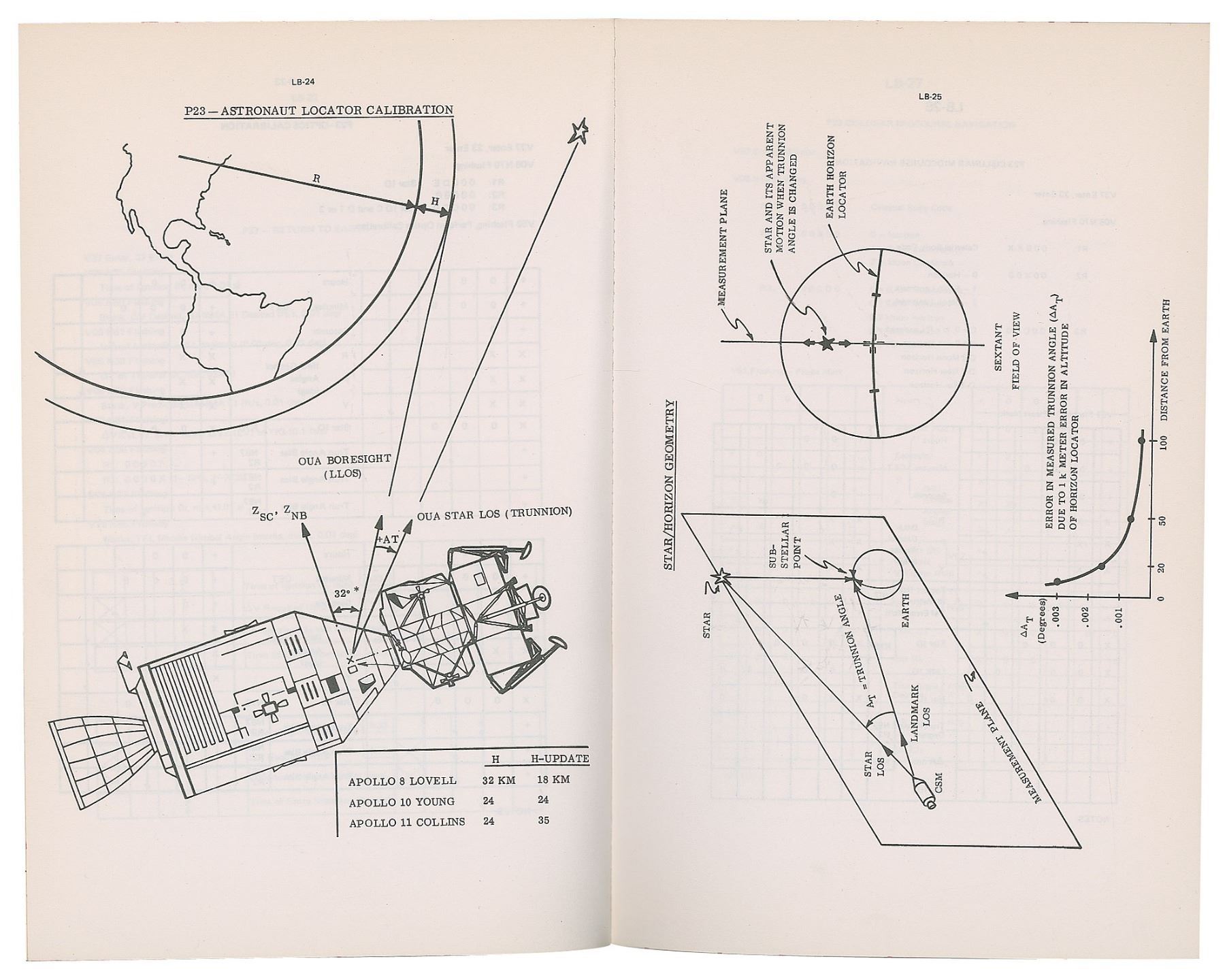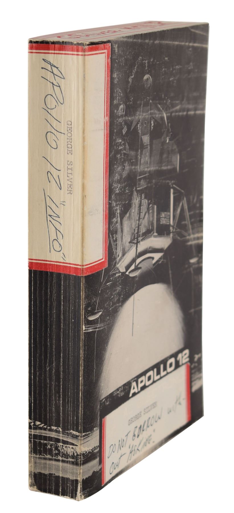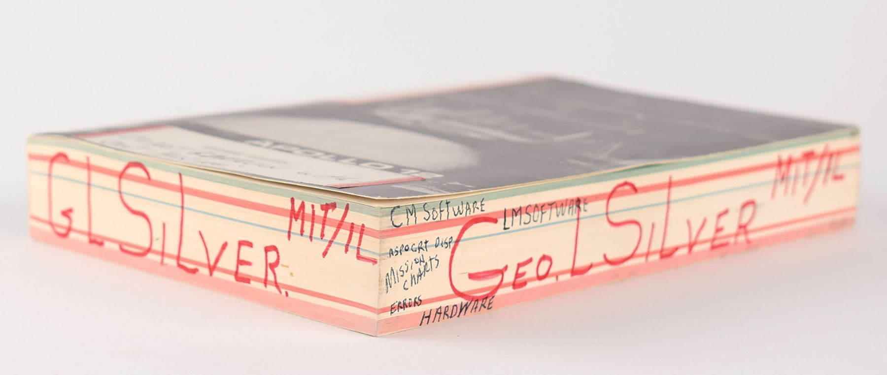 Apollo 12 "Guidance and Navigation Summary" manual by Delco Electronics, used by MIT engineer George Silver, 5.5 x 8.5, annotated on the textblock edges, "G. L. Silver, MIT/IL" and "Geo. L. Silver, MIT/IL," with the fore-edge marked with the contents of the various sections. The front cover also bears a typed "George Silver" label, annotated, "Do not borrow without 'asking,'" and the spine has a similar label, annotated, "Apollo 12 'Info.'" The manual has sections on "CM Software," "LM Software," "ASPO 45 CRT Displays," "Launch and Burn Schedule," "Burn Perturbations," and "Hardware," and contains numerous diagrams, instructions, lists, and code definitions related to the guidance and navigation systems used on the Apollo 12 lunar landing mission. Two pages boast annotations made during the mission, pertaining to the TLI. In fine condition, with light wear from use.