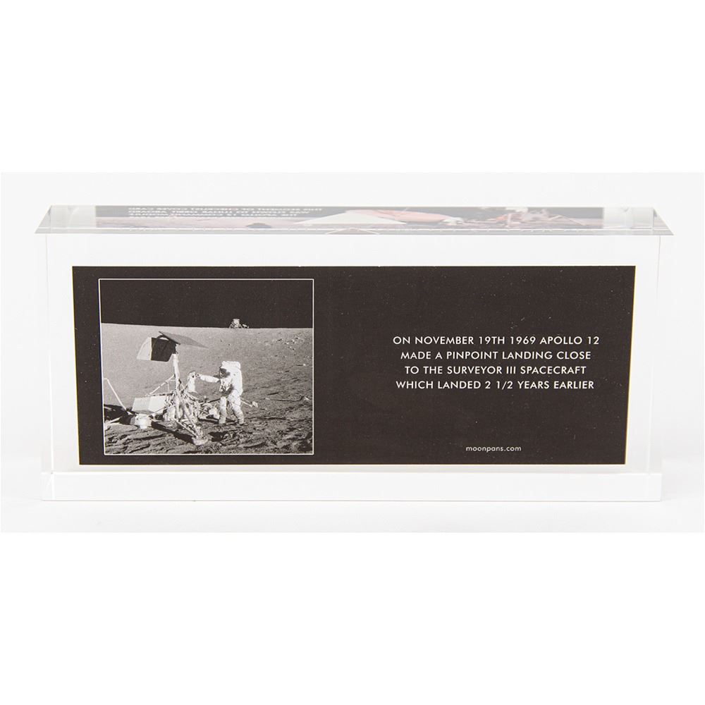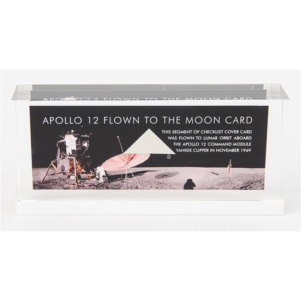 Limited edition acrylic display featuring a small triangular segment of checklist cover card flown into lunar orbit aboard the Apollo 1 Command Module 'Yankee Clipper' [attested to as flown by moonpans.com]. The segment measures about 1.25‰Û_ x .75‰Û_, and the acrylic block measures 7‰Û_ x 3.25‰Û_ x 1.5‰Û_. The segment dramatically floats in front of a panoramic image of Charles Conrad working at the foot of the Lunar Module at the Apollo 12 landing site. In fine condition. The acrylic display was produced by moonpans.com in an edition of only 140.