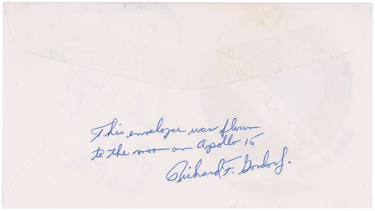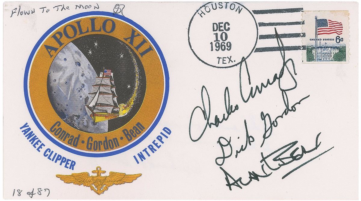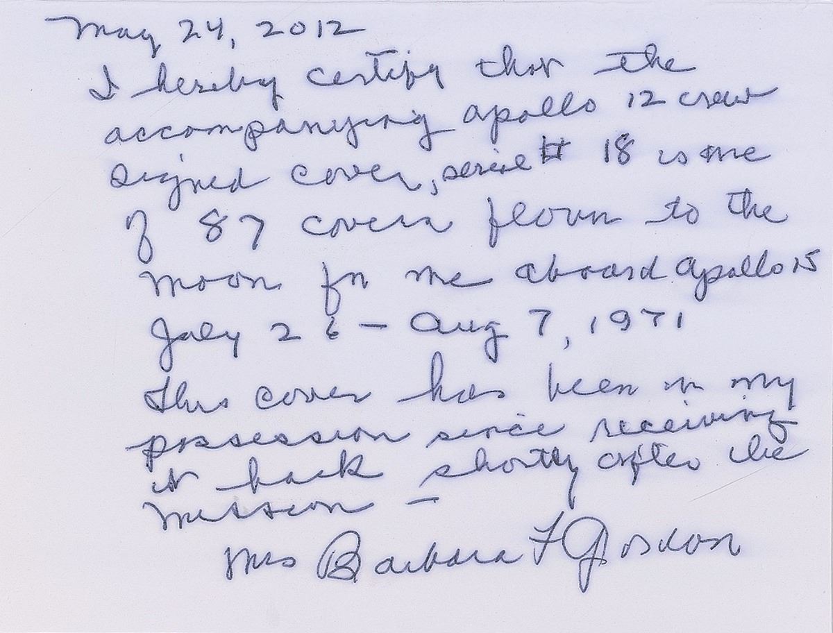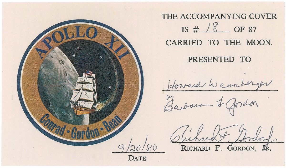 Very scarce Apollo 12 postal cover carried to the moon on the Apollo 15 mission, 6.5 x 3.5, numbered 18/87, signed in black felt tip by the Apollo 12 crew, Charles Conrad, Richard Gordon, and Alan Bean. Also signed and flight-certified on the reverse in blue ballpoint, “This envelope was flown to the moon on Apollo 15, Richard F. Gordon,” and again initialed and certified above the cachet in black ballpoint, “Flown to the Moon, RG.” In fine condition, with a trivial light fingerprint to the upper left corner. Accompanied by an additional certificate of authenticity signed by Richard Gordon and his wife Barbara, as well as a handwritten letter by Barbara, in part: “I hereby certify that the accompanying Apollo 12 crew signed cover…[was] flown to the moon for me aboard Apollo 15, July 26–Aug 7, 1971.” These covers were prepared to be carried on the Apollo 12 mission but did not make it due to an oversight; Jim Irwin later carried them on his Apollo 15 mission as a favor to Mrs. Gordon. These 87 were the only Apollo 12 cachet covers to be flown, making them quite scarce and highly desirable.