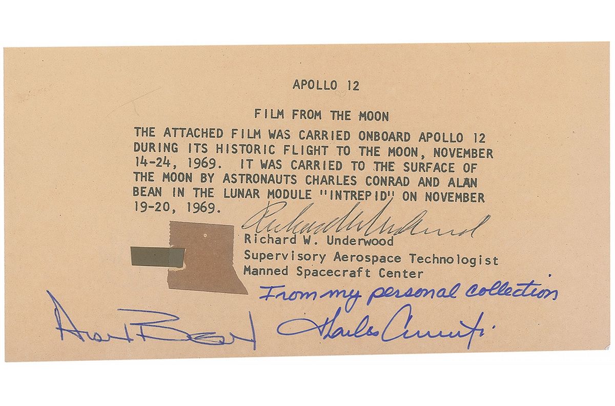A flown .75 x .25 piece of film carried to the lunar surface on board Apollo 12. Film is taped by its edges to a 6.5 x 4 certificate signed by Richard W. Underwood, Supervisory Aerospace Technologist at the manned Spacecraft Center which reads, in part: “The attached film was carried on board Apollo 12 during its historic flight to the moon…It was carried to the surface of the moon by astronauts Charles Conrad and Alan Bean in the lunar module ‘Intrepid’ on November 19-20, 1969.” Certificate is also signed in blue ink, “From my personal collection Charles Conrad, Jr.,” and “Alan Bean.” In fine condition. An interesting item certified by both of the Apollo 12 moonwalkers.