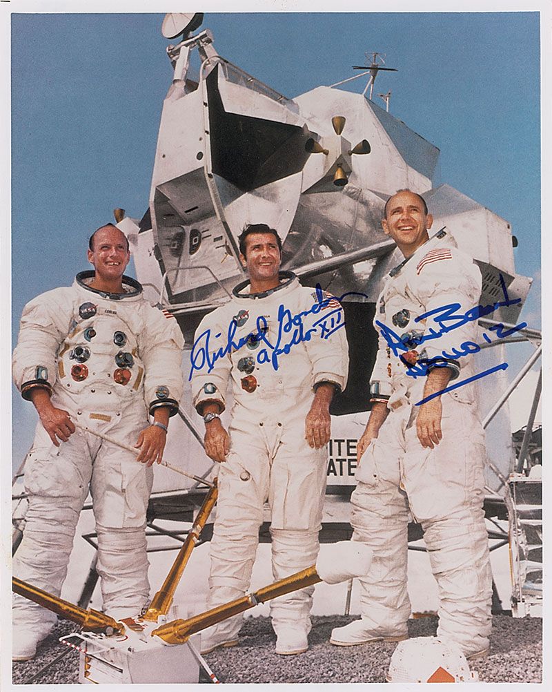 Color satin-finish 8 x 10 photo of the Apollo 12 crew posing together during training, signed in blue felt tip by Richard Gordon and Alan Bean, both adding their mission. In very fine condition.