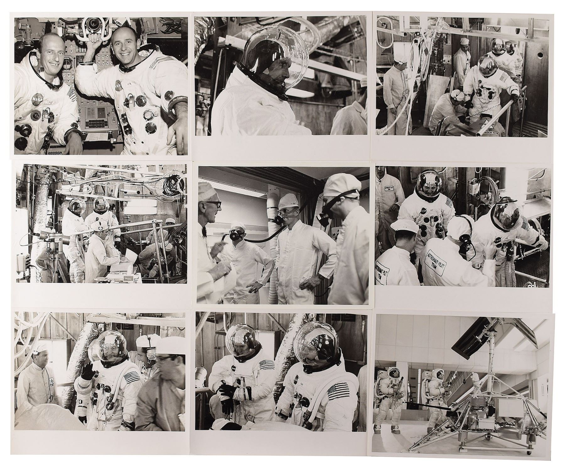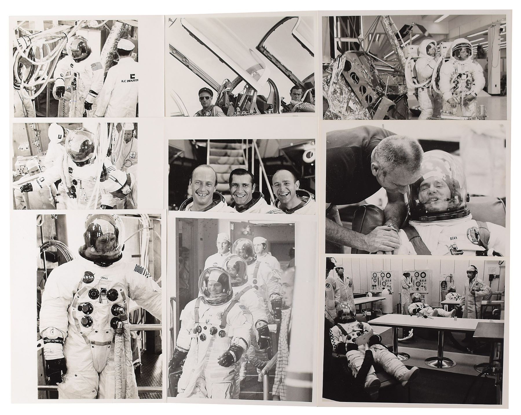 Appealing group lot of 18 vintage original NASA photographs of the Apollo 12 mission, glossy and matte-finish, 8 x 10 and 10 x 8, with the majority bearing purple NASA caption text and a few with "This Paper Manufactured by Kodak" watermarks on reverse. These fantastic photos document the various preflight activities required of Charles Conrad, Alan Bean, and Richard Gordon, showing the prime crew as they go through various simulation training exercises prior to their lunar-landing mission. In overall fine condition, with light wear to edges.