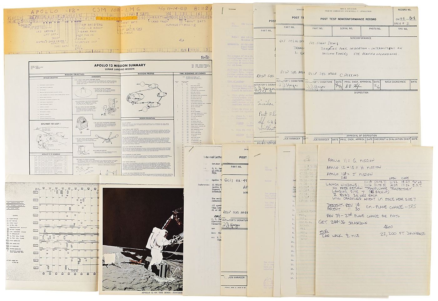 Various office material related to the Apollo 12 mission, which includes: a stapled ‘Mission Anomaly/Issue Summary’ for the Apollo 12 mission, with attached inter office letter dated November 24, 1969; a poster for the “Apollo 12 Mission Summary”; a copy of an 11-day timetable for the “Apollo 12 Flight Plan Summary”; a carbon copy of a handwritten timeline schedule for “Apollo 12, CSM 108–LM6,” dated November 14, 1969; copies of three internal letters from North American Rockwell related to “S/C 108 Flight Test Data Requirements,” NASA/MSC–MPAD Briefing on Apollo 12,” and “Apollo 12 Mission Support”; and copies of five ‘Post Test Nonconformance Records’ from the Space Division of North American Rockwell. In overall very good to fine condition.