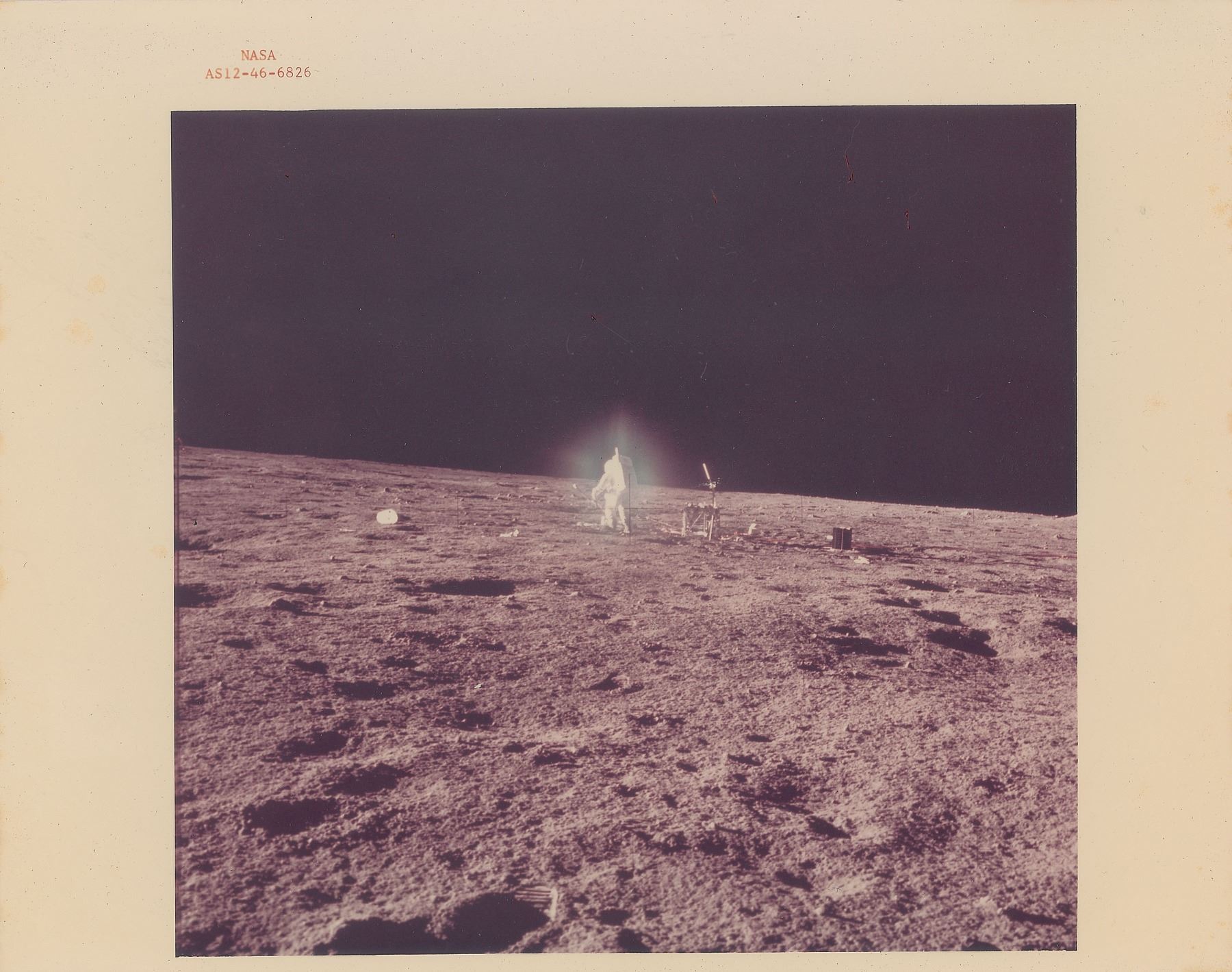 Official color glossy 10 x 8 red-numbered NASA photo (AS12-46-6826), which shows Apollo 12 LMP Alan Bean carrying the magnetometer experiment to its position on the lunar surface. Reverse bears "A Kodak Paper" watermarks and an affixed caption. In fine condition.