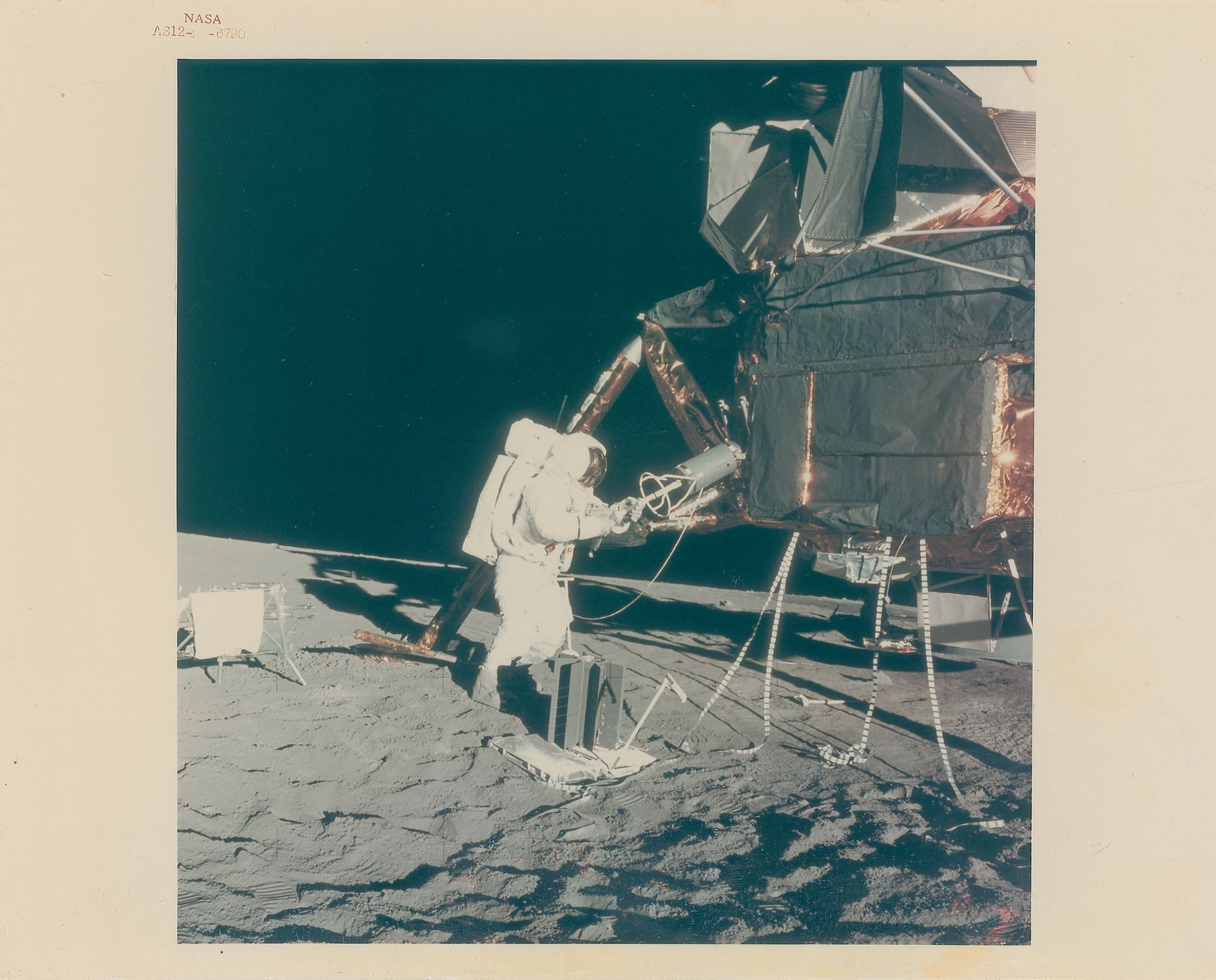 Official color glossy 10 x 8 red-numbered NASA photo (AS12-46-6826), which shows Apollo 12 LMP Alan Bean using a fuel transfer tool to remove the fuel element from the fuel cask mounted on the LM's descent stage. Reverse bears "A Kodak Paper" watermarks. In fine condition.