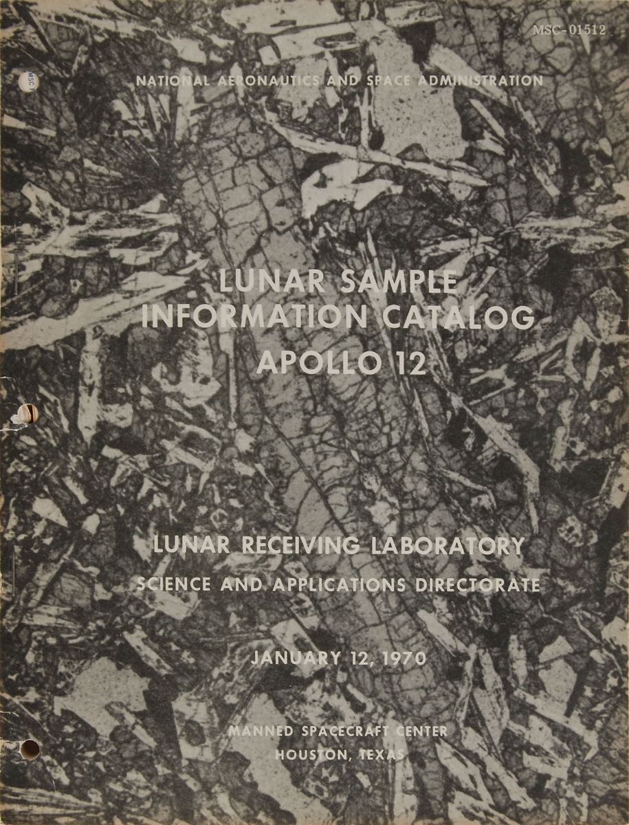 Two rare official NASA reports: one volume entitled “Lunar Sample Information Catalog, Apollo 12,” produced by the Lunar Receiving Laboratory, 8 x 10.5, 317 pages, January 12, 1970; and a volume entitled “Mineralogy and Petrology of the Apollo 12 Lunar Sample,” produced by the Smithsonian Astrophysical Observatory, Special Report 333, 8.5 x 11, 272 pages, May 20, 1971. In fine condition, with water damage to the back cover and last few pages of the Lunar Sample Information Catalog.