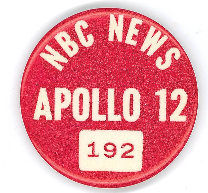 A red 2.5-inch diameter NBC News Apollo 12 press pin, #192. In fine condition, with some scattered light surface marks.