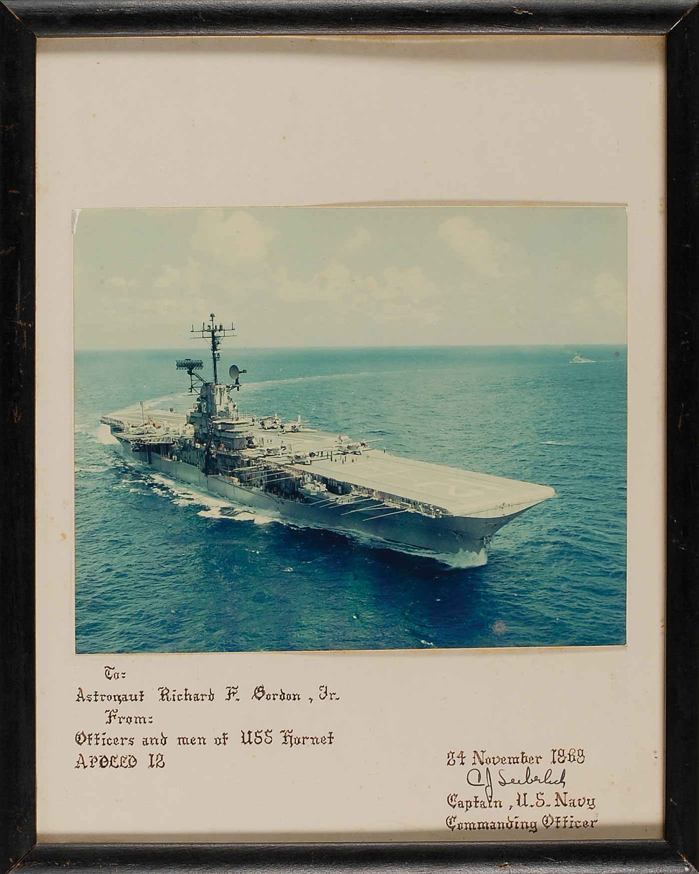 Color glossy 9.5 x 7.5 photo of the USS Hornet on the high seas, affixed to a 10.75 x 14 mount, inscribed on the mount in black ink in a calligrapher’s hand, “To: Astronaut Richard F. Gordon, Jr., From: Officers and men of the USS Hornet, Apollo 12, 24 November 1969,” and signed by commanding officer C. J. Seiberlich. Framed to an overall size of 12 x 15. In fine condition, with some scattered light foxing to photo and mount. Unique chance to obtain something given to an Apollo astronaut immediately upon his return to Earth, from the man who headed the recoveries of both Apollo 11 and 12.
