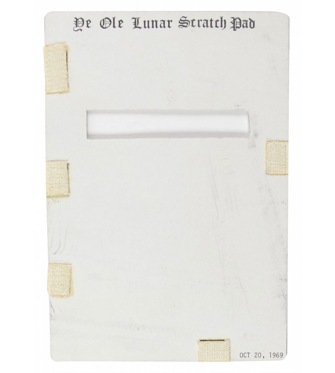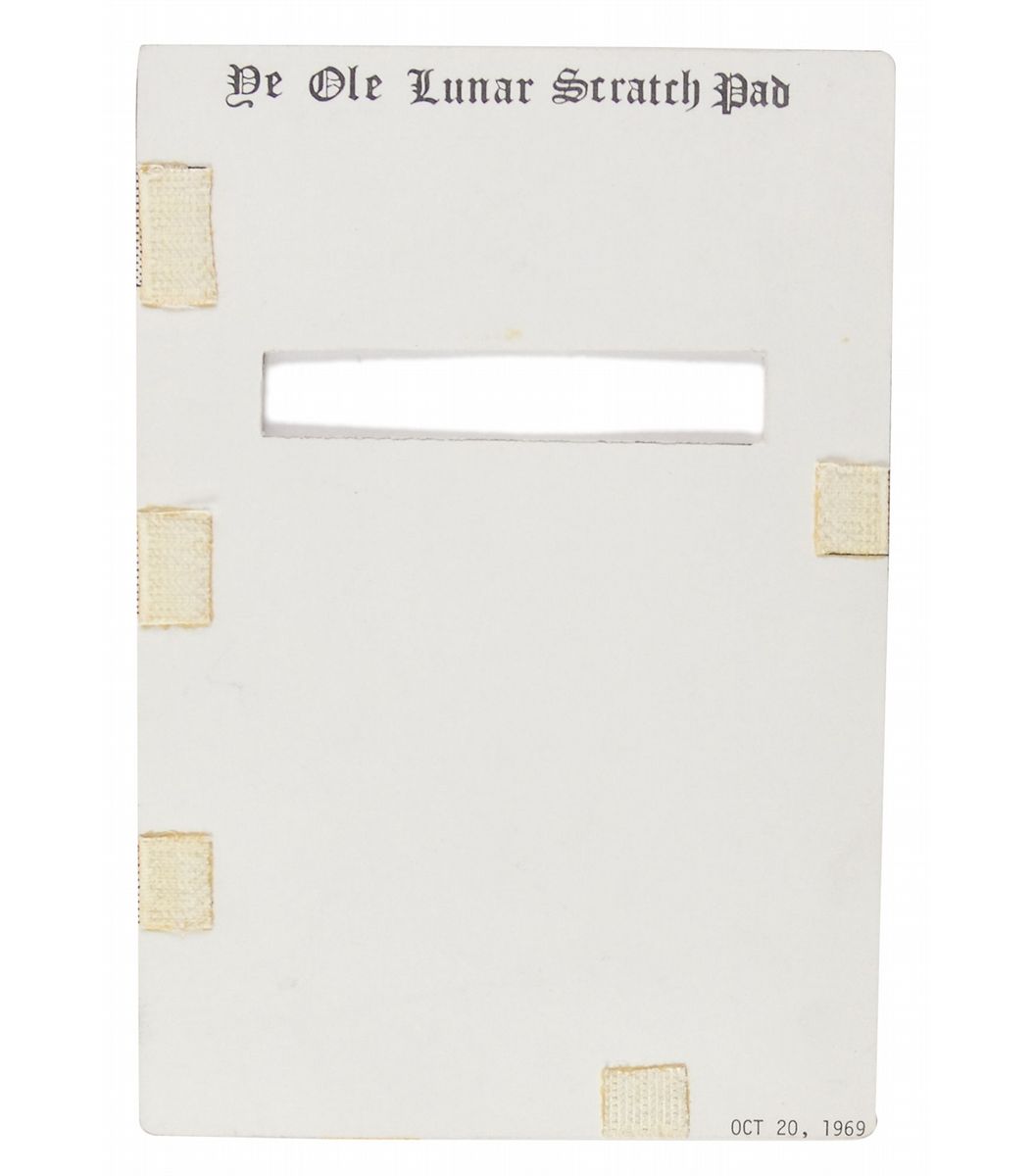 Flown instrument panel data card, flown on the Apollo 12 mission. Blank card measures 5.25 x 8, is dated October 20, 1969, in the lower corner, and is labeled along the top on both sides, “Ye Ole Lunar Scratch Pad.” Card also has five small swatches of Velcro affixed to each side. Accompanied by a certificate of authenticity from Richard Gordon which reads: “I hereby certify that this Flown Instrument Panel Data Card is from my personal collection and was flown and utilized by me on the Apollo 12 mission.” In fine condition.