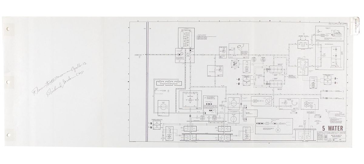 Flown Apollo CSM water and waste schematic, 27.75 x 10.5, carried into lunar orbit during the Apollo 12 mission. Four-fold schematic is labeled on the tab, “Water & Waste Mgt.,” and details the internal systems for the water and waste system of the Command Module. Signed on the blank left panel, “Flown to the Moon on Apollo 12, Richard Gordon CMP.” Accompanied by a letter of authenticity from Moonpans, which reads, in part: “This large 4-fold schematic detailing the Apollo 12 CSM Water & Waste Management Systems, was flown to the moon on Apollo 12…as part of the Apollo 12 CSM Systems Data Checklist…The page is from the personal collection of Apollo 12 CMP Dick Gordon and was flown to the moon.” In fine condition.