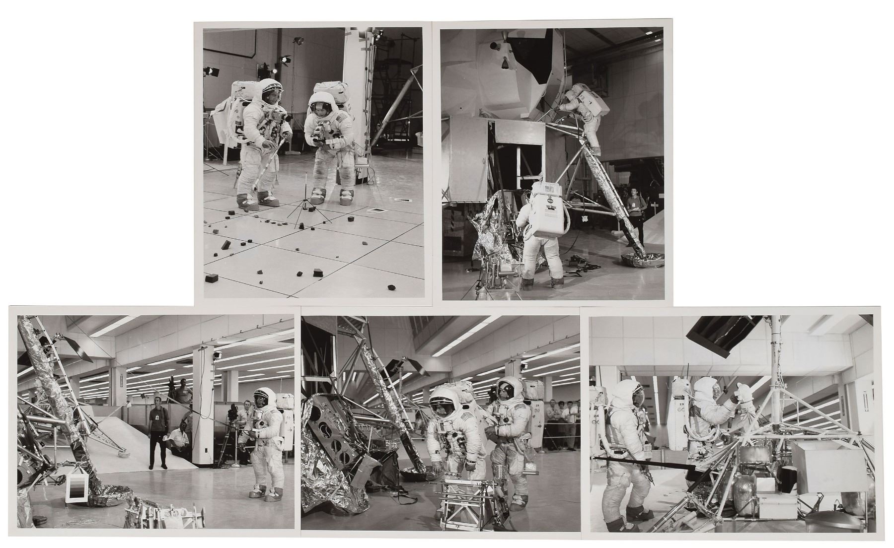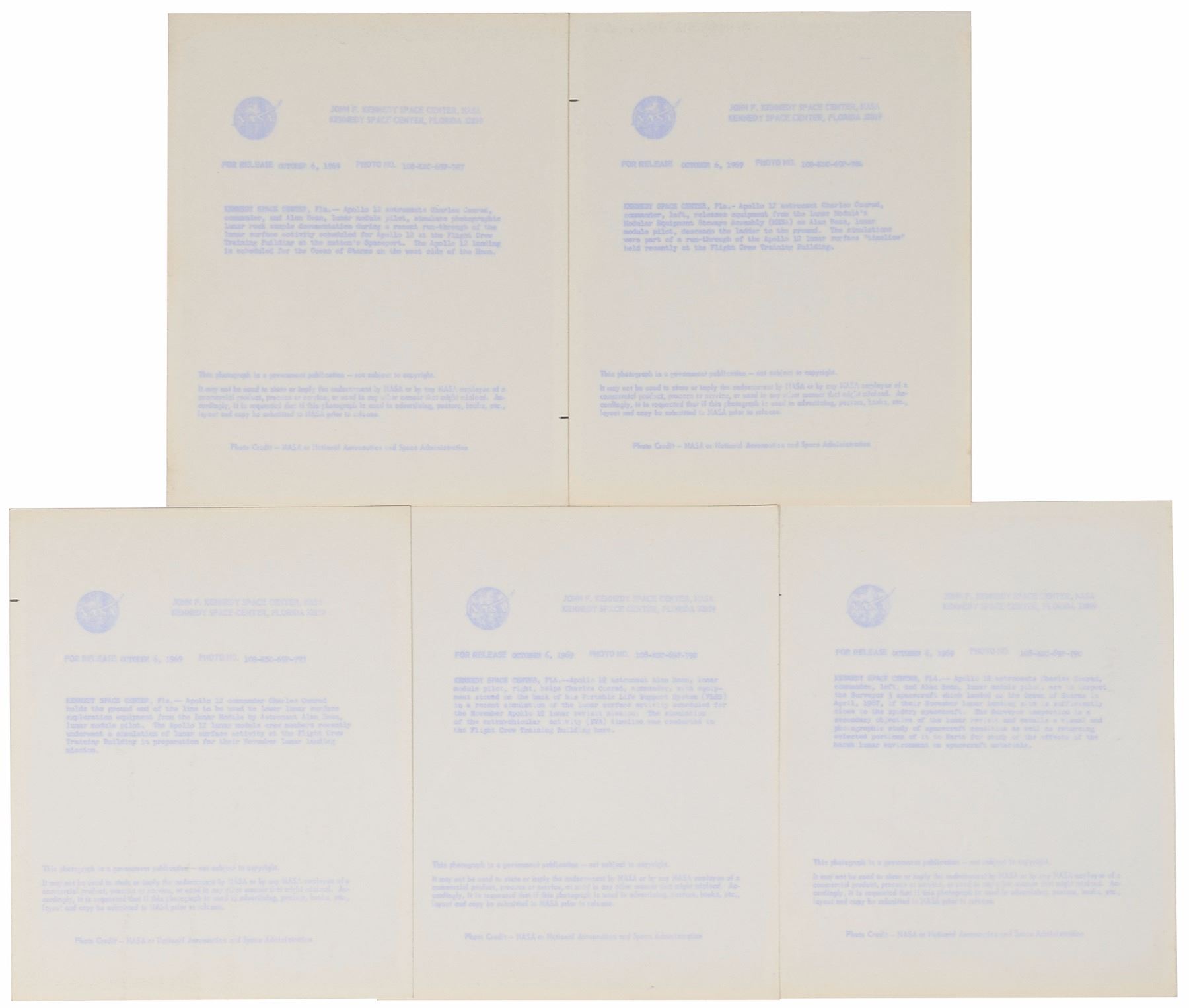 Set of five original vintage glossy NASA photos, 8 x 10 and 10 x 8, depicting the two-man lunar module crew of Apollo 12 during training activities at the Spaceport’s Flight Crew Training Building, with images including: a full-length image of CDR Charles Conrad and LMP Alan Bean simulating photographic lunar rock sample documentation; an image of Bean assisting Conrad with equipment stowed on the back of his Portable Life Support System; a full-length image of Conrad and Bean working on the lunar module; an image of the two astronauts inspecting the Surveyor 3 spacecraft; and an image of Conrad lowering lunar exploration equipment from the lunar module. Reverse of each photo bears official purple NASA caption text. In overall fine condition.