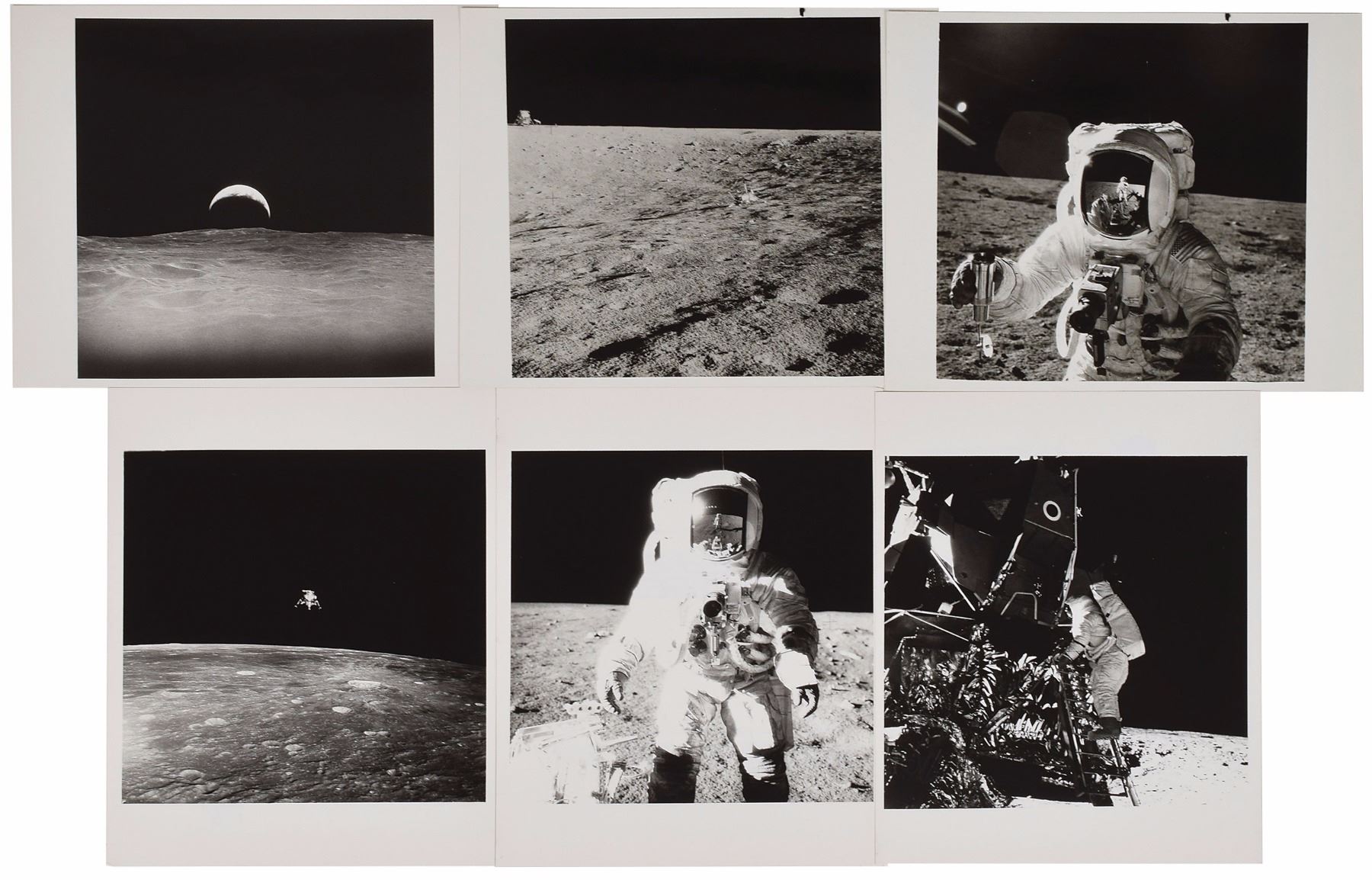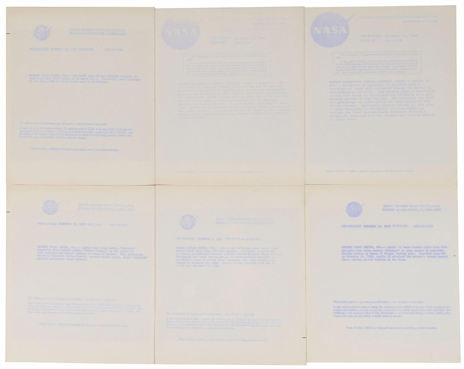 Set of six original vintage glossy NASA photos, ranging in size from 8 x 10 to 10.25 x 8, showing various lunar images from the Apollo 12 mission, including: CDR Charles Conrad holding a container of lunar soil; a three-quarter-length photo of Conrad, with LMP Alan Bean reflected in his visor; a full-length image of Bean descending the ladder of the lunar module; the lunar module Intrepid preparing its descent onto the lunar surface; an image of the Surveyor III spacecraft on the side of a crater, with the lunar module in the background; and a lovely crescent image of the Earth above the rolling lunar landscape. Reverse of each photo bears “A Kodak Paper” watermarks. In overall fine condition.
