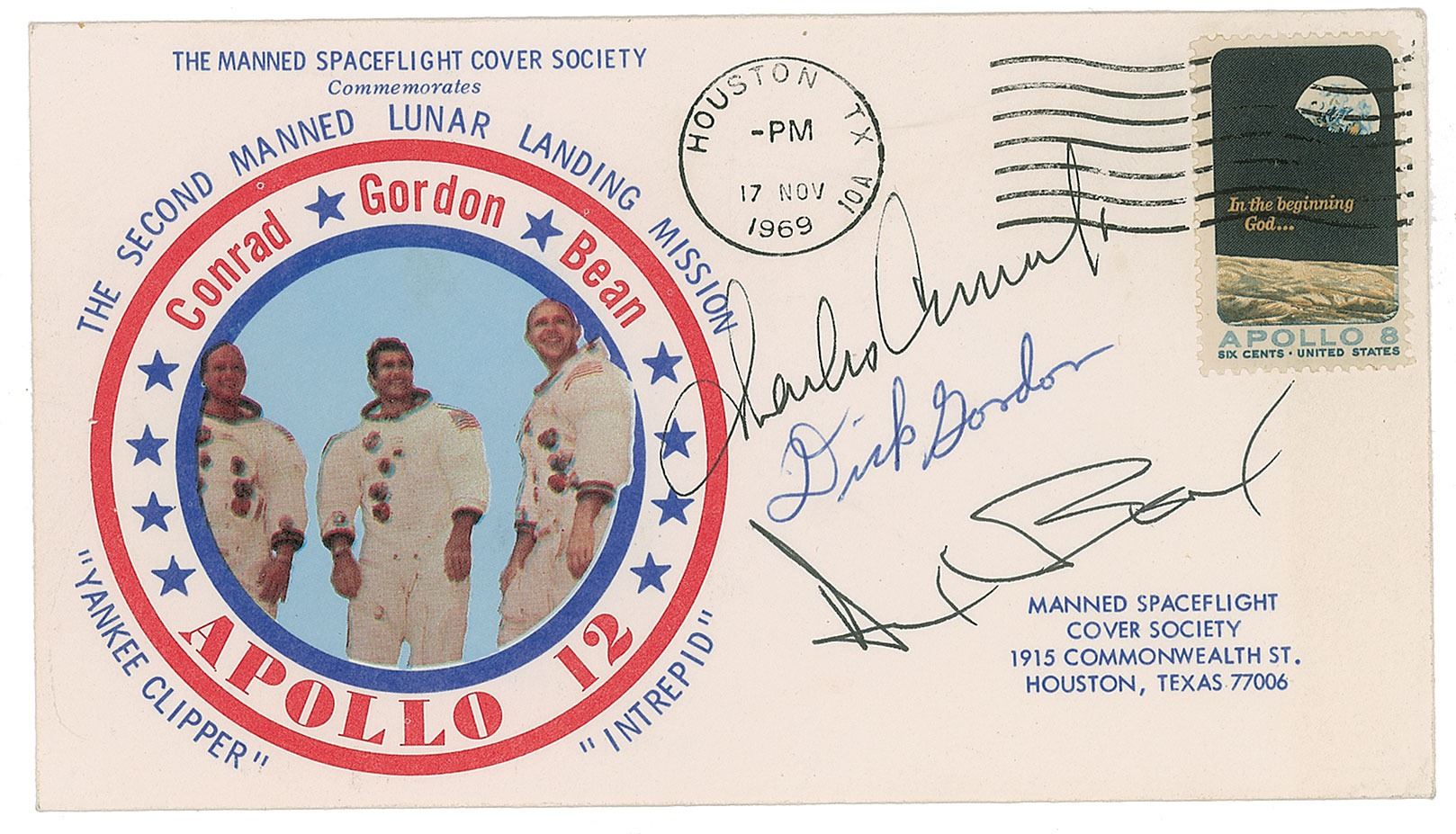 Scarce Manned Spaceflight Cover Society commemorative cover featuring a wonderful color cachet honoring the Apollo 12 mission and crew, signed in blue ballpoint, "Dick Gordon," and in black ink, "Charles Conrad, Jr." and "Alan Bean." In fine condition.