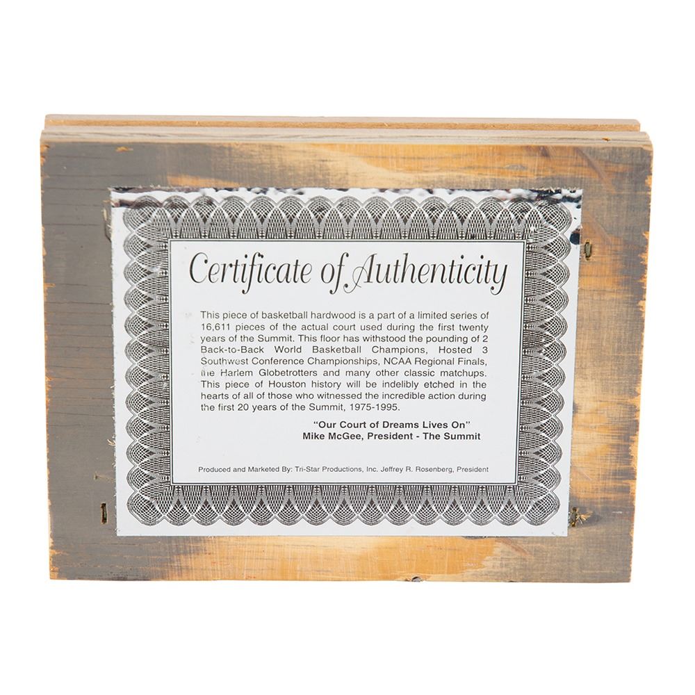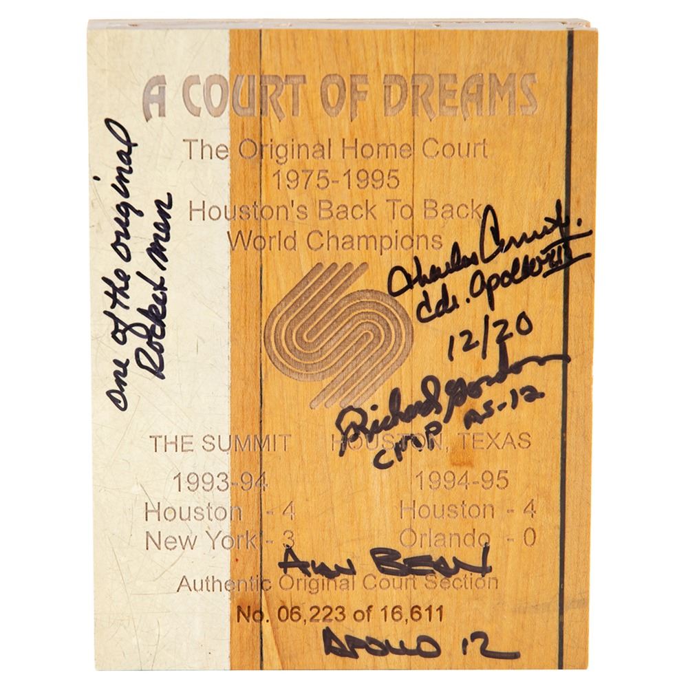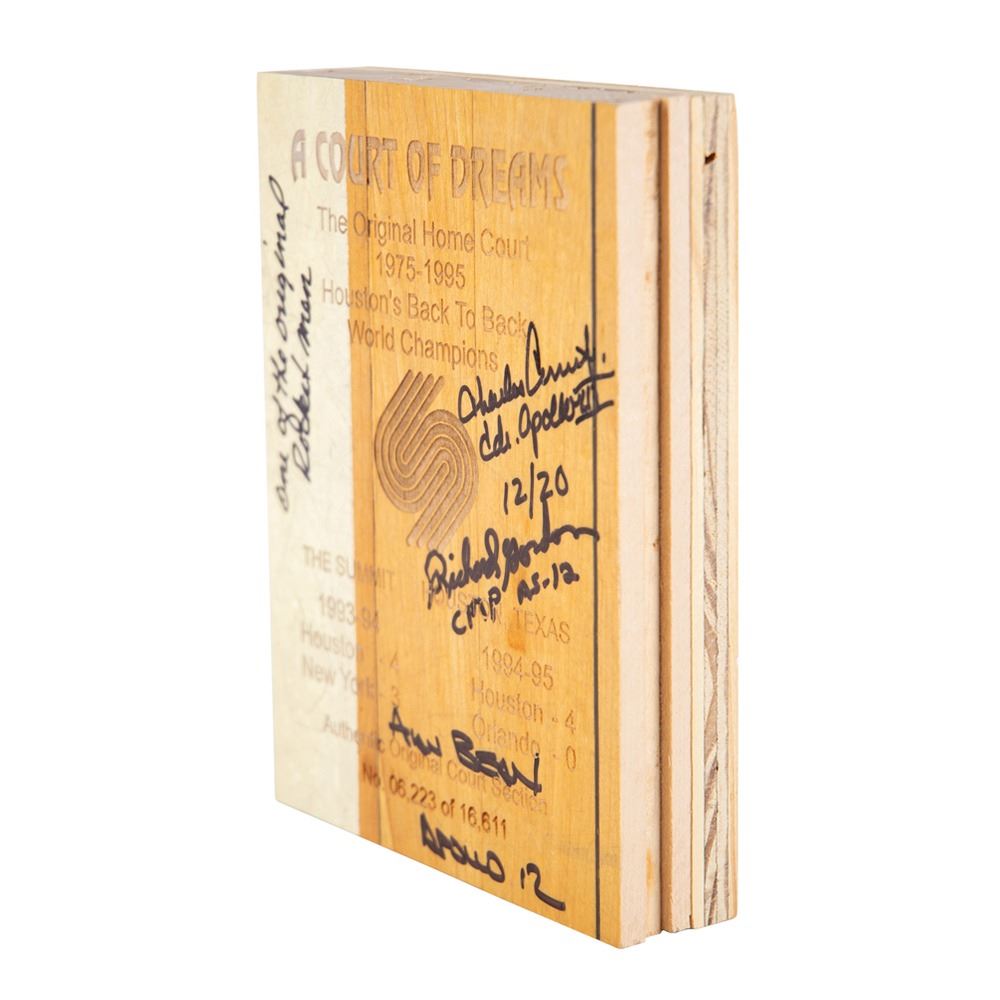 Limited edition original section of NBA hardwood from 'The Summit,' the former home court of the Houston Rockets basketball team, 5Ë x 6.5Ë x 1.25Ë, numbered 6,223/16,611, signed in black felt tip by the full crew of the Apollo 12 mission: “Charles Conrad, Jr., Cdr. Apollo XII, 12/20,†who adds along the left side, “One of the original rocket men,†“Richard Gordon, CMP AS-12,†and “Alan Bean, Apollo 12.†The basketball court section, entitled “A Court of Dreams,†features engraved text to front, and the reverse bears an affixed certificate of authenticity. In fine condition.