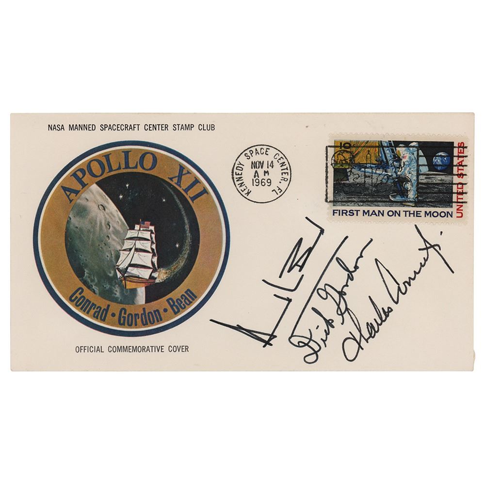 Desirable Apollo 12 'Type 2' insurance cover bearing a mission emblem cachet with NASA Manned Spacecraft Center Stamp Club text, postmarked at the Kennedy Space Center on November 14, 1969, the launch day of the Apollo 12 mission, signed in black felt tip, "Alan L. Bean," "Dick Gordon," and "Charles Conrad, Jr." In very fine condition.