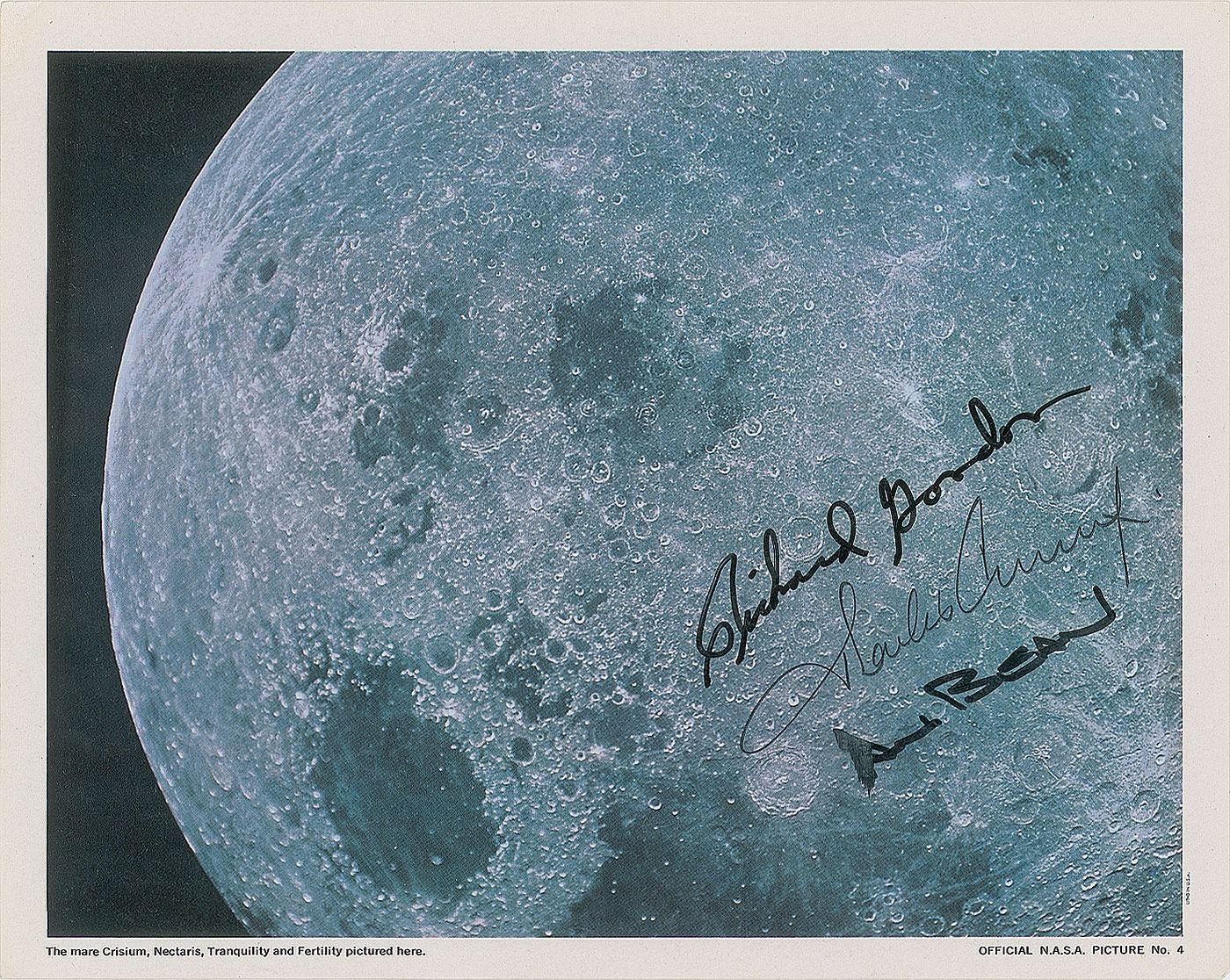 Official color semi-glossy 10 x 8 lightweight NASA photo of the lunar surface, signed in black felt tip by Richard Gordon, Charles Conrad, and Alan Bean. In fine condition, with a brush to the "A" in Bean's signature.