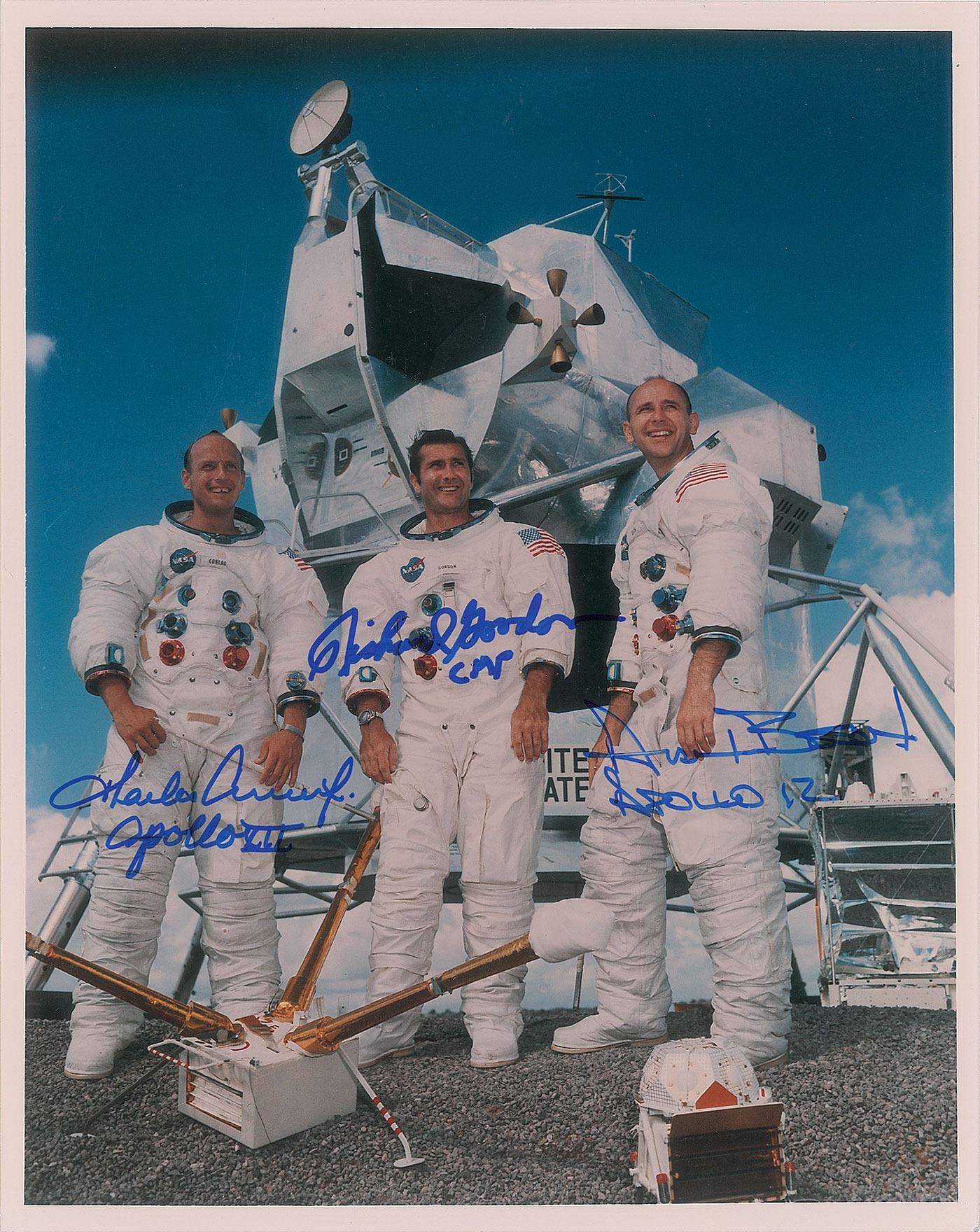 Color satin-finish 8 x 10 photo of the Apollo 12 crew in front of the Lunar Module, signed in blue felt tip, "Charles Conrad, Jr., Apollo XII," "Richard Gordon, CMP," and "Alan Bean, Apollo 12." In fine condition, with a trivial surface crease to the top.
