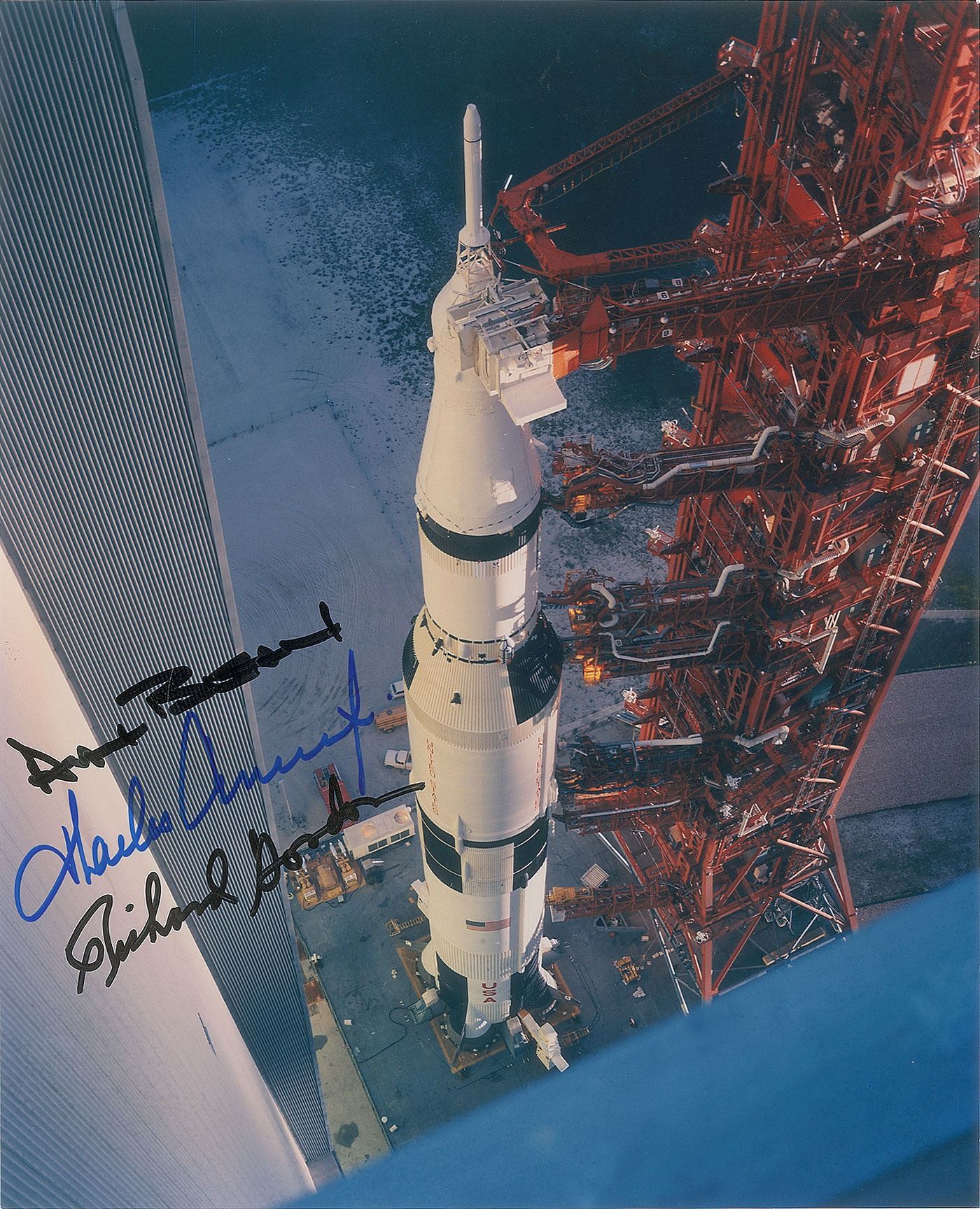 Striking color satin-finish 8 x 10 photo of the Saturn V rocket on the launch pad, signed in blue and black felt tip by Alan Bean, Charles Conrad, and Richard Gordon. In fine condition, with a trivial small crease to the upper left corner.