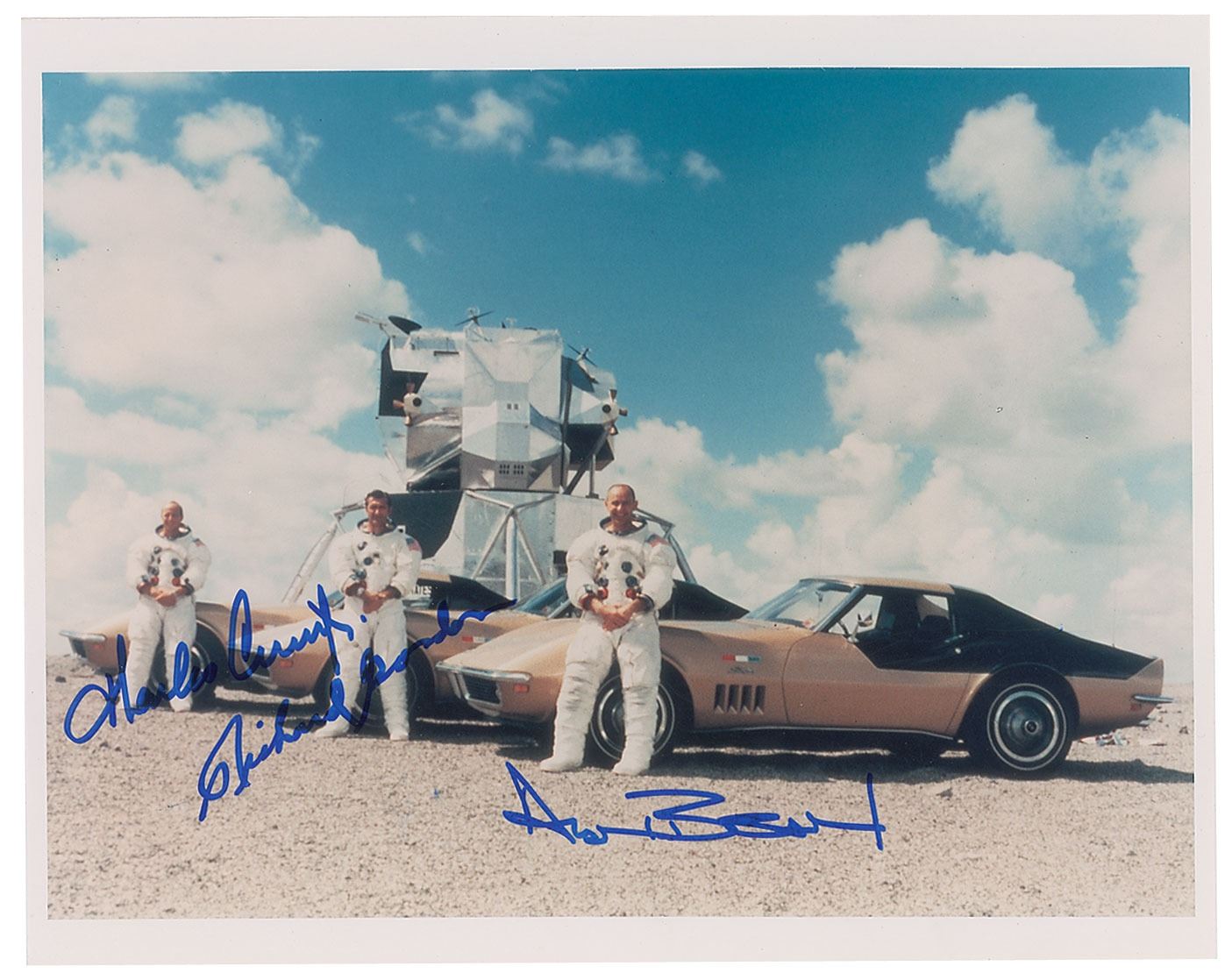Color satin-finish 10 x 8 photo of the Apollo 12 crew posing with their Corvettes and the Lunar Module, signed in blue felt tip by Alan Bean, Charles Conrad, Jr., and Richard Gordon. In fine condition, with a somewhat soft photo quality.
