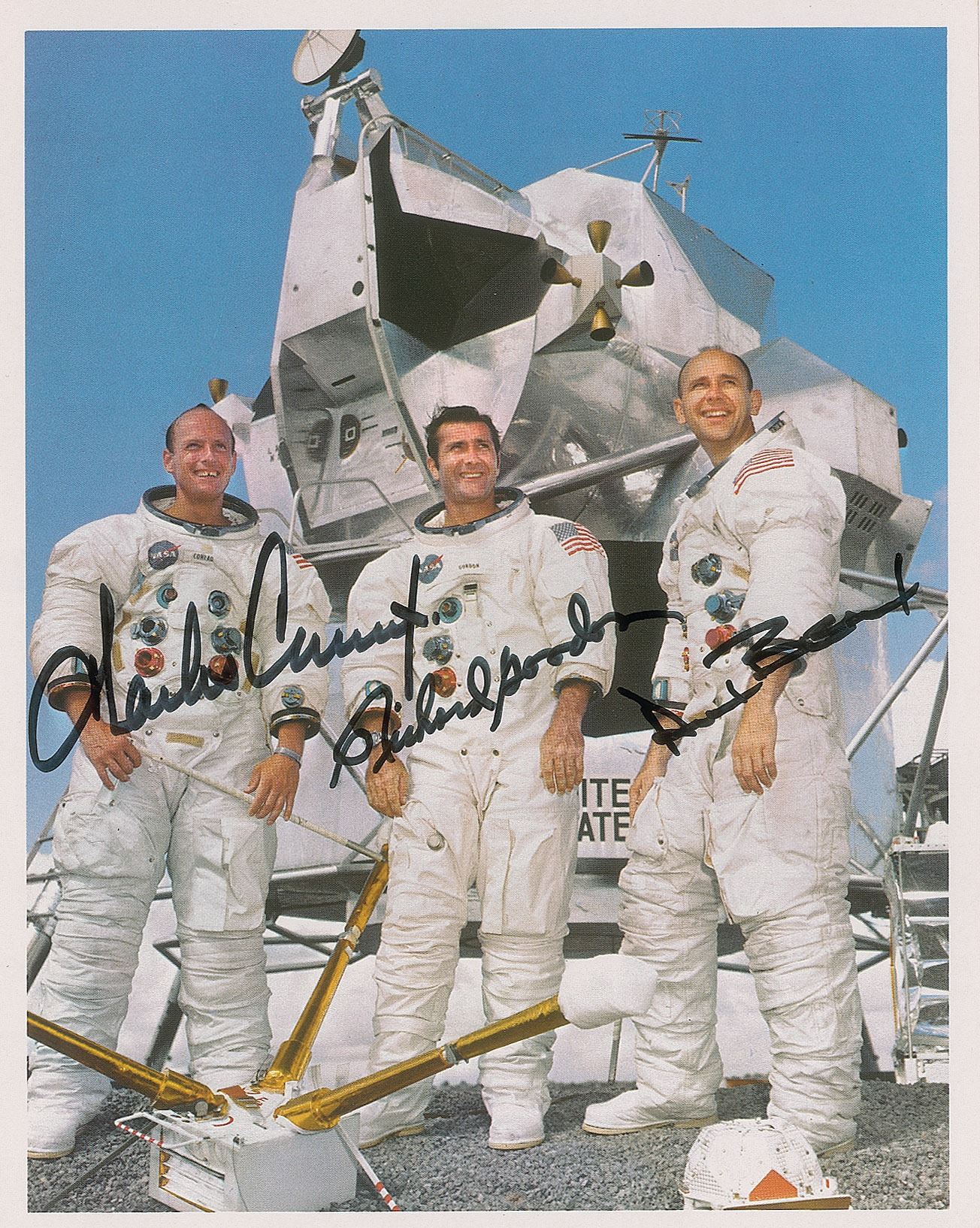 Official color 8 x 10 NASA lithograph of the Apollo 12 crew posing in their white space suits in front of the lunar module, signed boldly in black felt tip by Alan Bean, Charles Conrad, and Richard Gordon. In very fine condition.