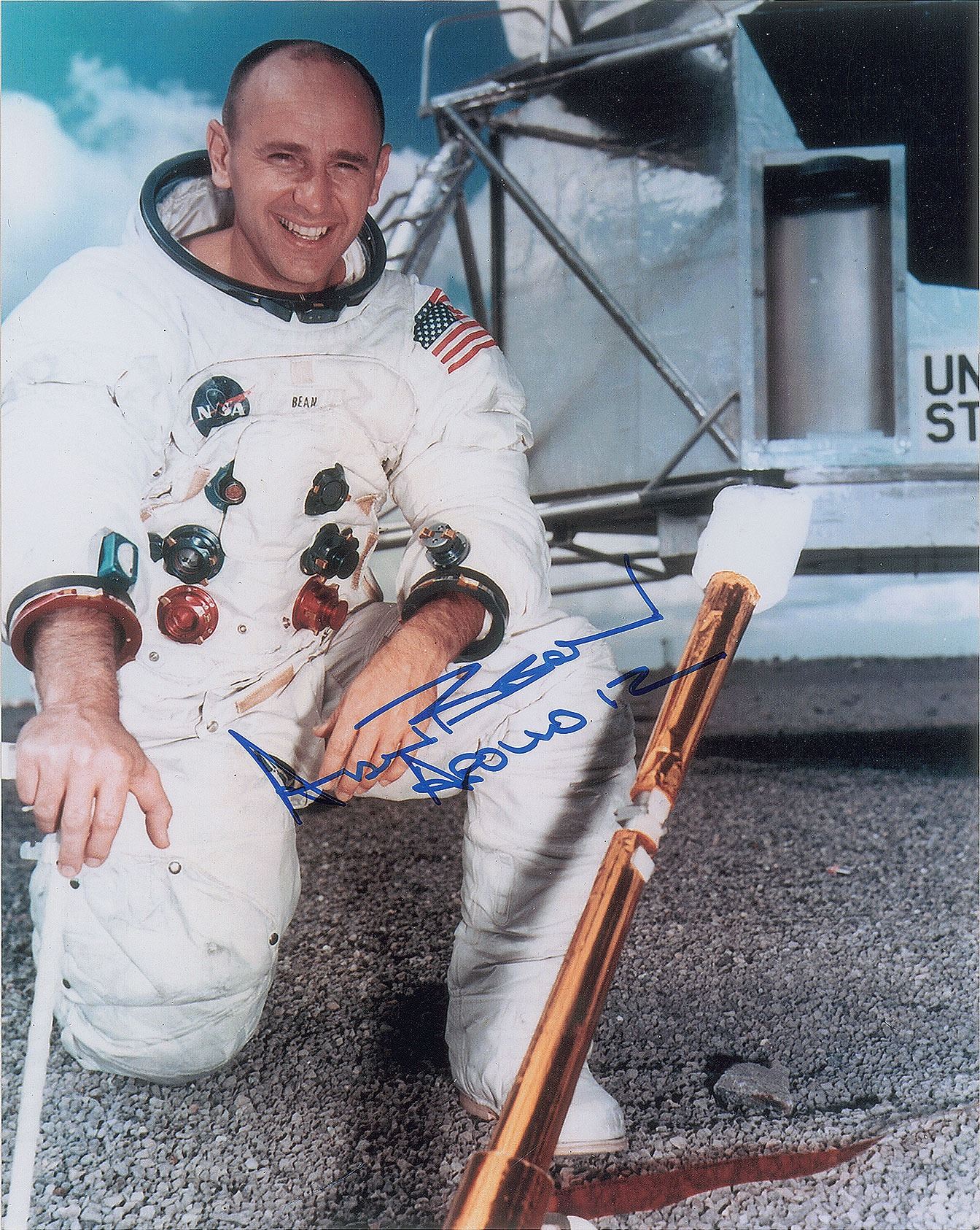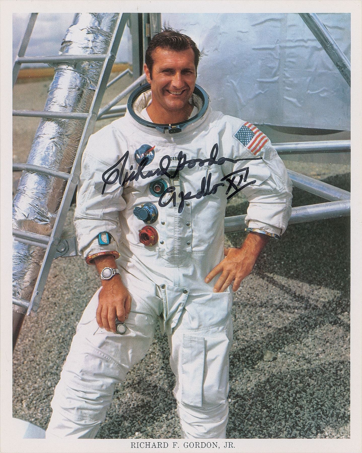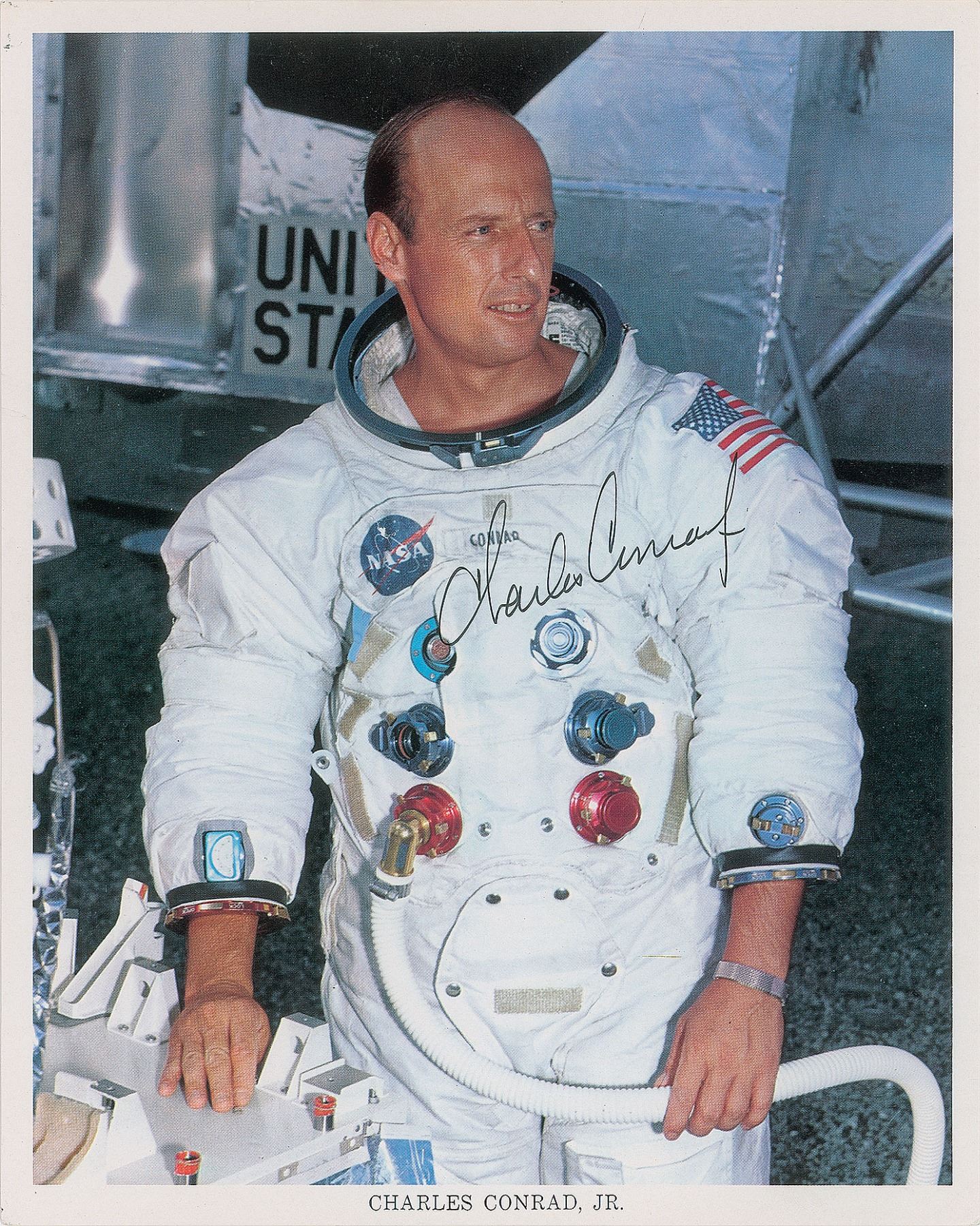 Three color 8 x 10 photos of the individual members of the Apollo 12 crew: an official NASA lithograph of Charles Conrad in his white space suit, signed in black felt tip; an official NASA lithograph of Richard Gordon in his white space suit, signed in black felt tip; and a satin-finish photo of Alan Bean in his white space suit, signed in blue felt tip. In overall fine condition, with a small tear to the NASA emblem on Conrad's space suit.