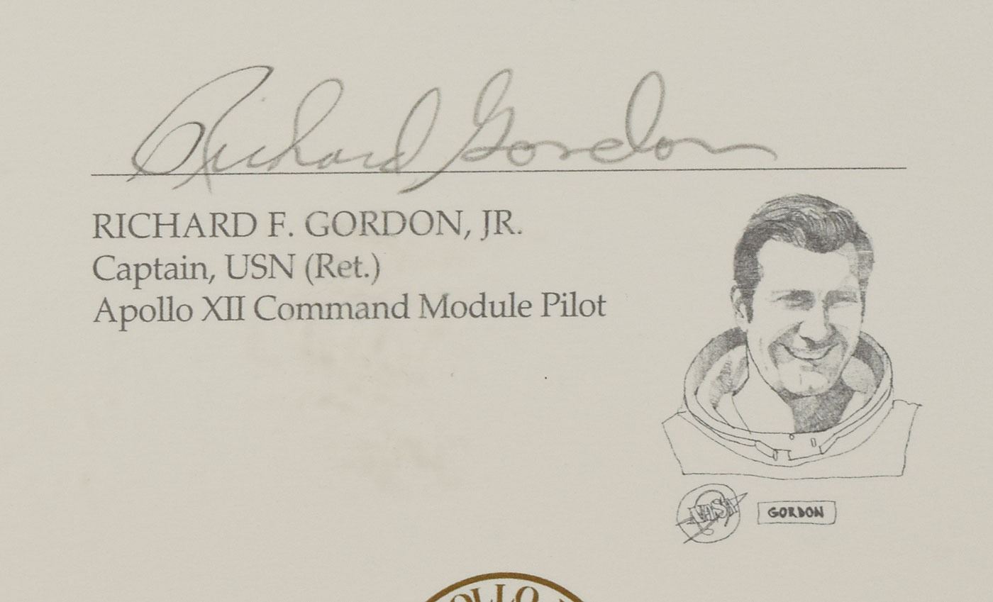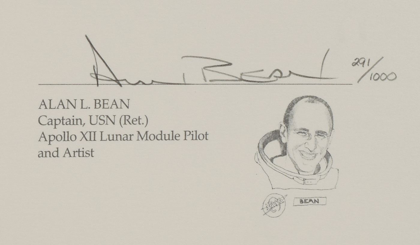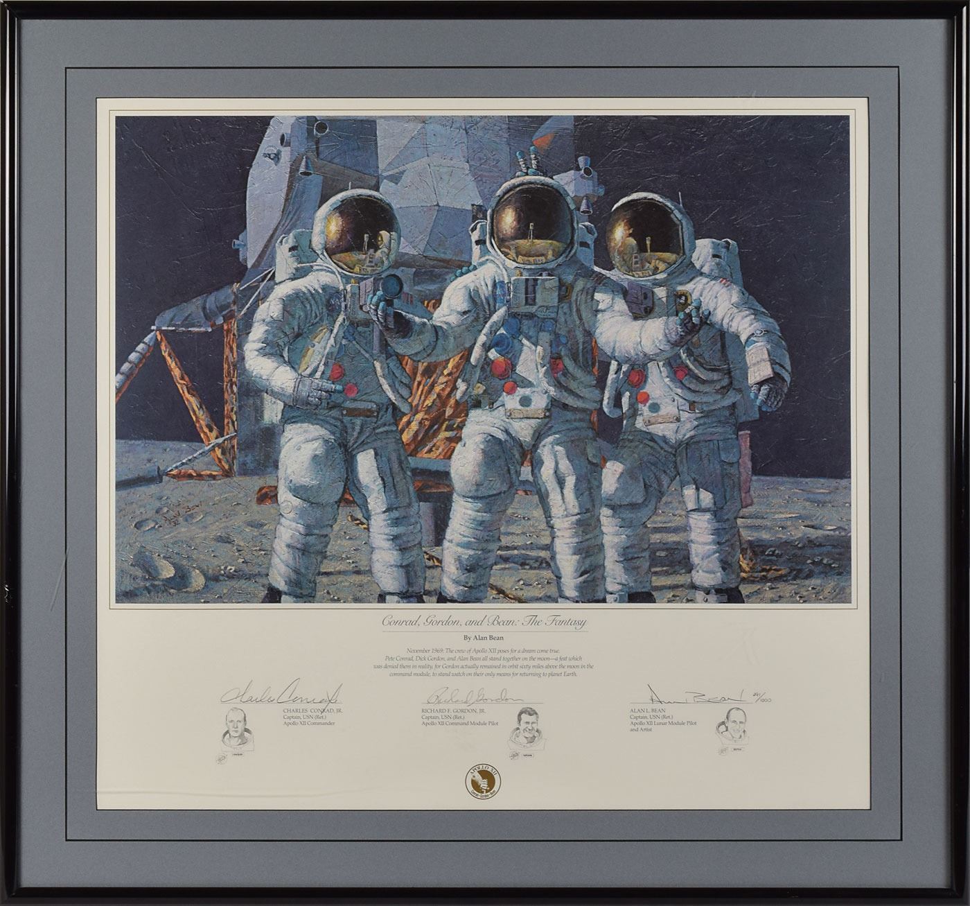 Color limited edition 24.75 x 23 print entitled 'Conrad, Gordon, and Bean: The Fantasy,' numbered 291/1000, depicting all three members of Apollo 12 together on the lunar surface, signed in pencil by Charles Conrad, Richard Gordon, and artist Alan Bean. Matted and framed to an overall size of 31.25 x 29.25. In fine condition.