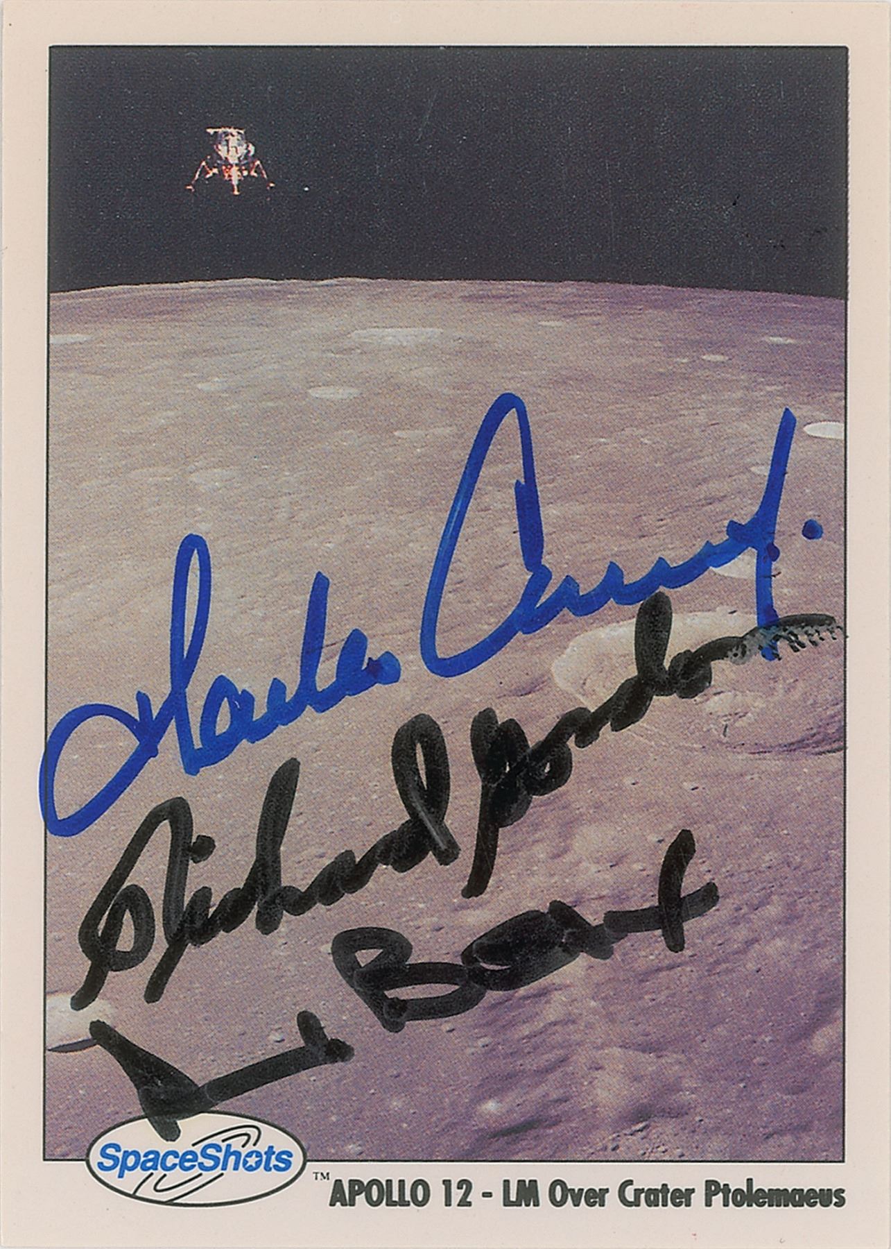 SpaceShots trading card, 2.5 x 3.5, card no. 35, showing the Apollo 12 lunar module flying over the crater Ptolemaeus, signed on the front in blue felt tip, "Charles Conrad," and in black felt tip, "Richard Gordon" and "Alan Bean." In fine condition. An uncommon fully signed format.