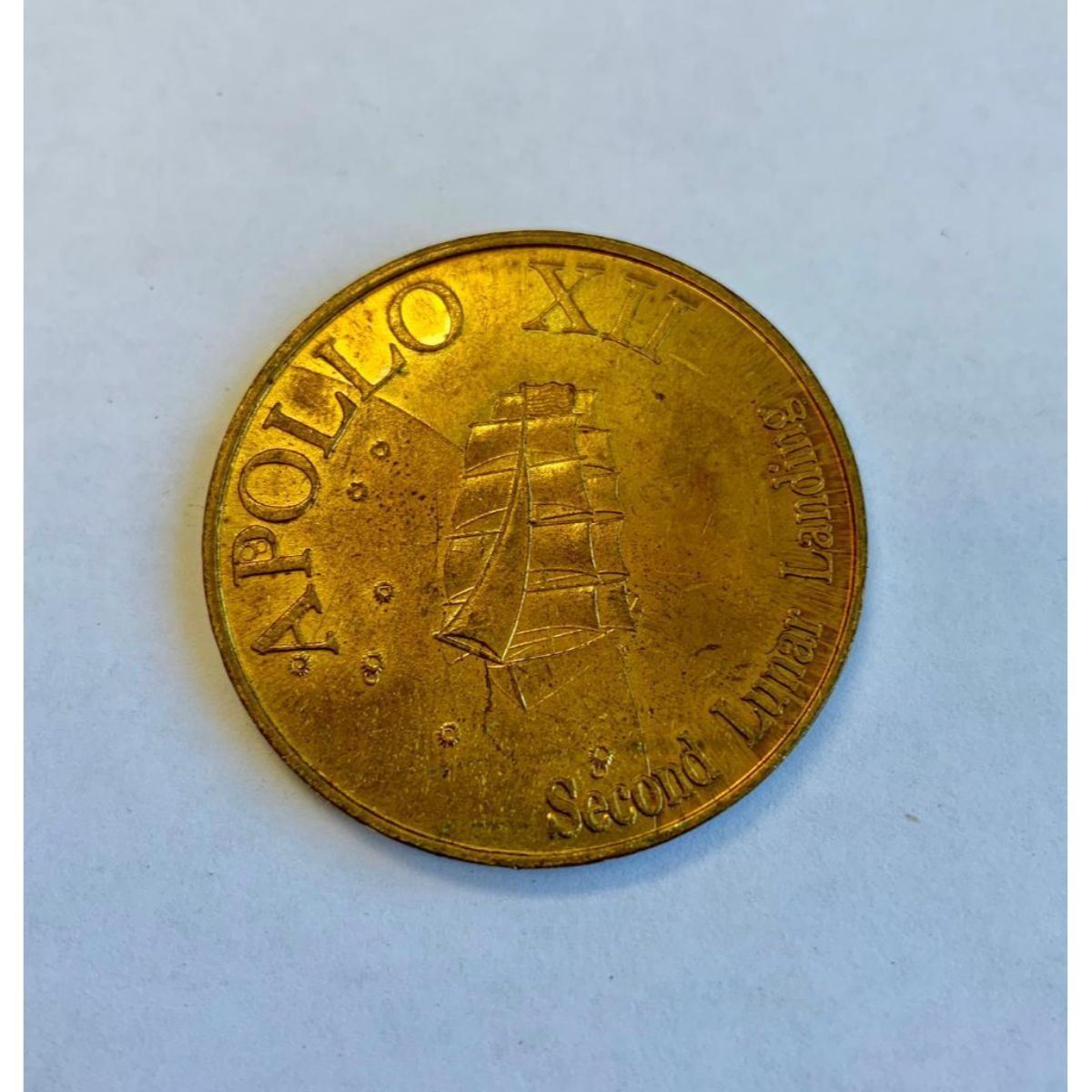 This coin is a memorial piece, following the first moon landing in 1969. It is made of brass, but the coin's obverse and reverse are unique and hard to find. Please view photos for further details.Â