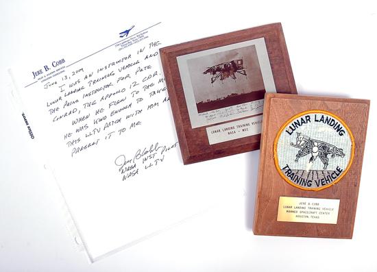 Apollo 12, c1969, FLOWN "Lunar Landing Training Vehicle" Patch (4") on a rectangular wooden plaque with a descriptive plaque that reads: "Jere B. Cobb / Lunar Landing Training Vehicle / Manned Spacecraft Center / Houston, TX". The LLTV was the flight vehicle by means of which the astronauts learned how to fly the Lunar Landing Module. A handwritten coa on the consignor's letterhead stationery reads: "I was an instructor in the Lunar Landing Training Vehicle and the prime instructor for Pete Conrad, the Apollo 12 Cdr. When he flew to the moon he was kind enough to take this LLTV patch with him and present it to me (upon his return)". An extremely rare piece of memorabilia that may well be unique.